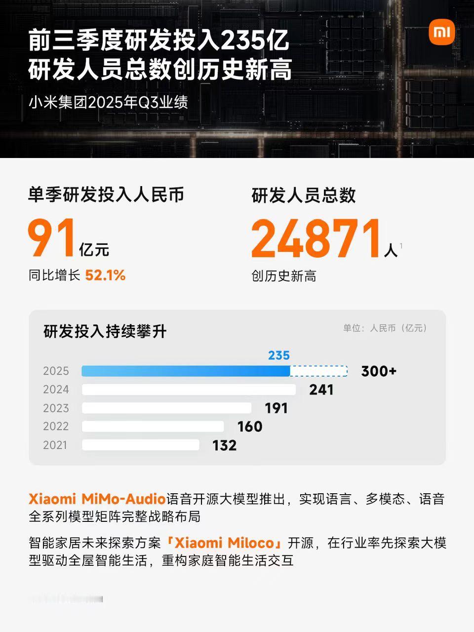 不出意外嗷,小米汽车已经实现单季度盈利!这是小米目前仅有2款车型、第二款车上市不到半年的优秀结果!整体营收方面,小米集团连续4季度营收破千亿、利润连续3季度破百亿,持续稳健增长。第三季度小米集团营收1131亿元,同比增长22.3%;盈利113亿元,同比增长81%,历史最高水平。同时,小米的“人×车×家 全生态”持续发力,手机业务稳健增长,高端化持续突破;汽车及AI业务单季收入逼近300亿元,首个季度正向盈利,业务彻底正向发展;高端家电在激烈行业竞争下均价持续上涨,毛利率提升,且武汉家电工厂竣工投产......小米的第三季度财报,相当不错