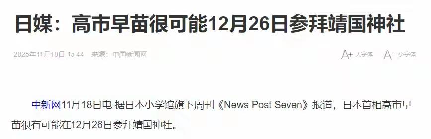 “不权威日媒”报道,高市早苗很可能12.26参拜靖国神厕[思考]日子显然是“精挑细选”,这个“蛇妖化形”是真的“妖”啊[发怒] [吃瓜群众]不过,这依然还是“相互恶心”层面,贸易制裁等实体措施还是要审慎——可以考虑把“日本天皇”的中文标准称谓改了,直接改成“日本国王”简称“日王”,和英国一致,牠们也打不出喷嚏[灵光一闪]