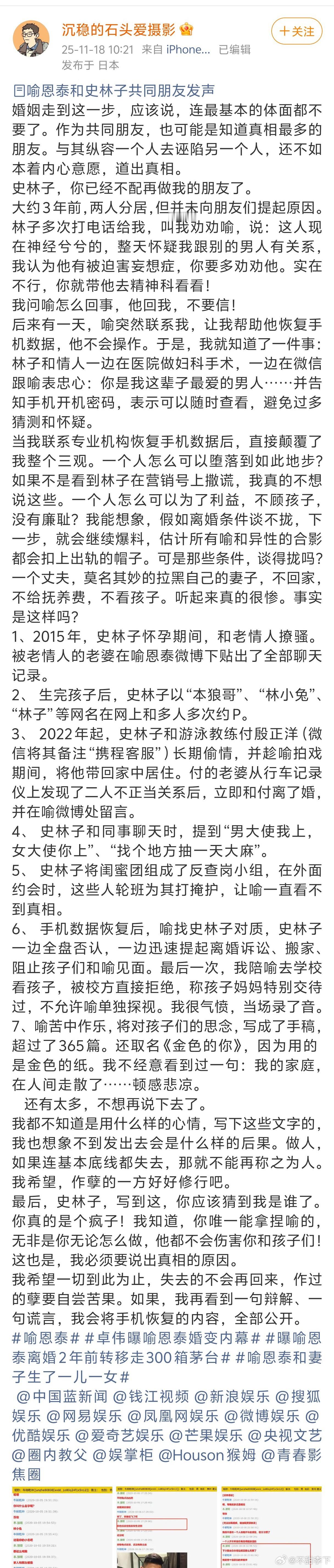 之前卓伟爆料喻恩泰也就是武林外传里的吕秀才闹离婚,冷暴力老婆孩子,失联。然后今天他们俩人共同的朋友出来发微博说是吕秀才的老婆多次出轨。文字太长了你们自己看吧,发的证据还挺多的