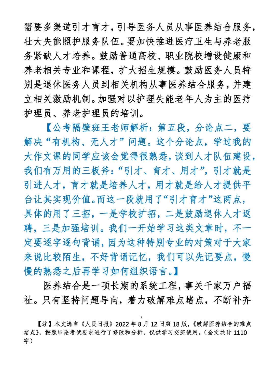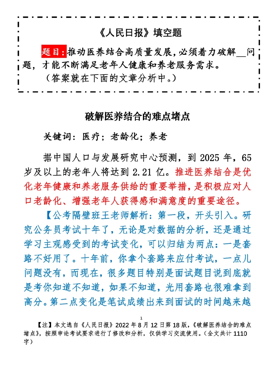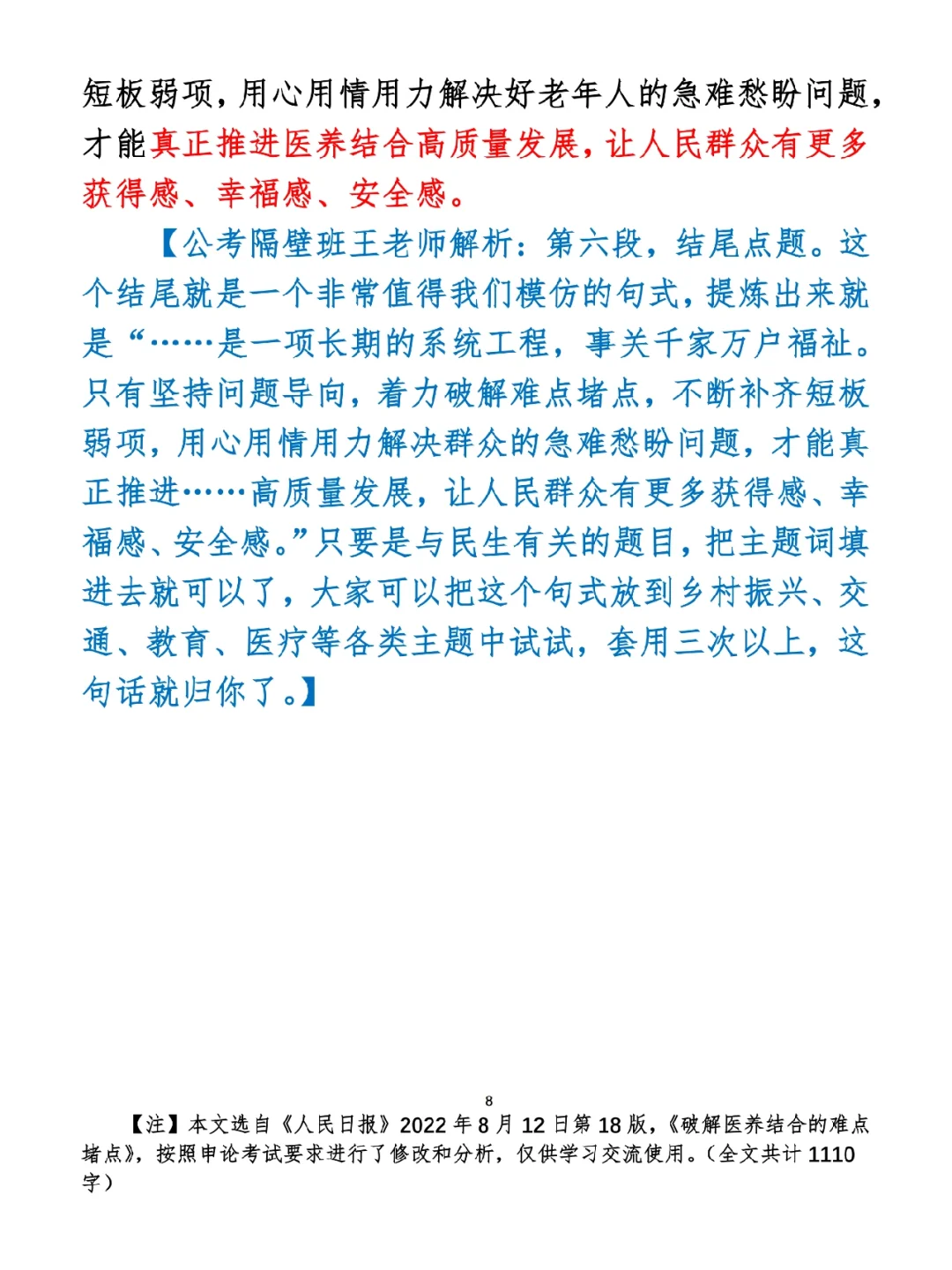 今日打卡作业: 1. 完成填空题 2. 抄写全文红字+划线部分内容 3. 写完后在留言区打卡 ⭐️ ⭐️ ⭐️ ⭐️ ⭐️ ⭐️ 如何抄写:每天的抄写文章以图片形式发在“公考隔壁班王老师”账号,红色字是重点句和结构句,黑色字是正文,蓝色字是解析,大家抄写时不必抄蓝色字。建议先通读全文(包括蓝色解析部分),做到心中有数再开始抄写,效果会更好。 关于文章:抄写文章来源于人民日报,但每篇文章我都根据申论考试要求进行了修改,主要集中在四个方面:一是重写或修改开头、结尾;二是统一段首句句式结构;三是调整段落字数,使文章结构更均衡;四是简化复杂长难句,使之更具可模仿性。每篇文章修改幅度不同,无论修改多少,都是基于申论考试要求,毫无对人民日报文章品评之意。(此处致敬人民日报) 关于解析:我会在文章每段后面加一段蓝色字的解析,是我自己在抄写时的感悟,篇幅时间有限,不能面面俱到,但求重点突出。如果你有其他感悟,也希望能在评论里分享,我们相互学习、共同进步。 ⭐️ ⭐️ ⭐️ ⭐️ ⭐️ ⭐️ 这里是公考隔壁班王老师独创的“每天半小时・申论80分”抄写团,欢迎加入我们!