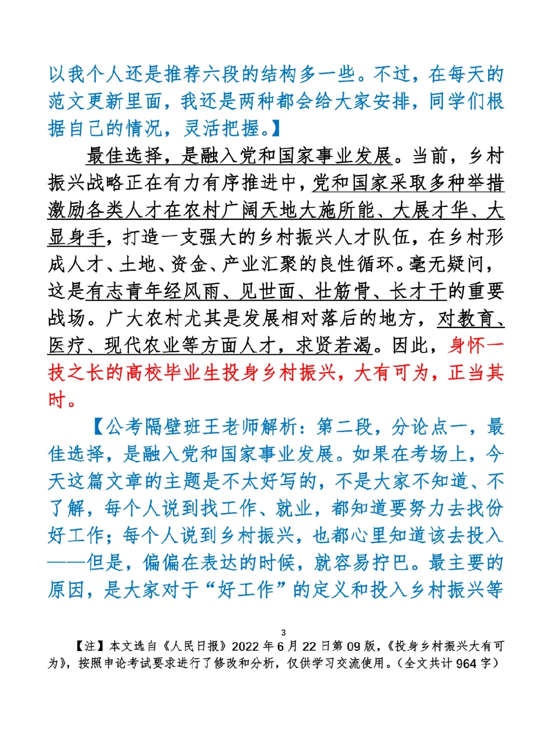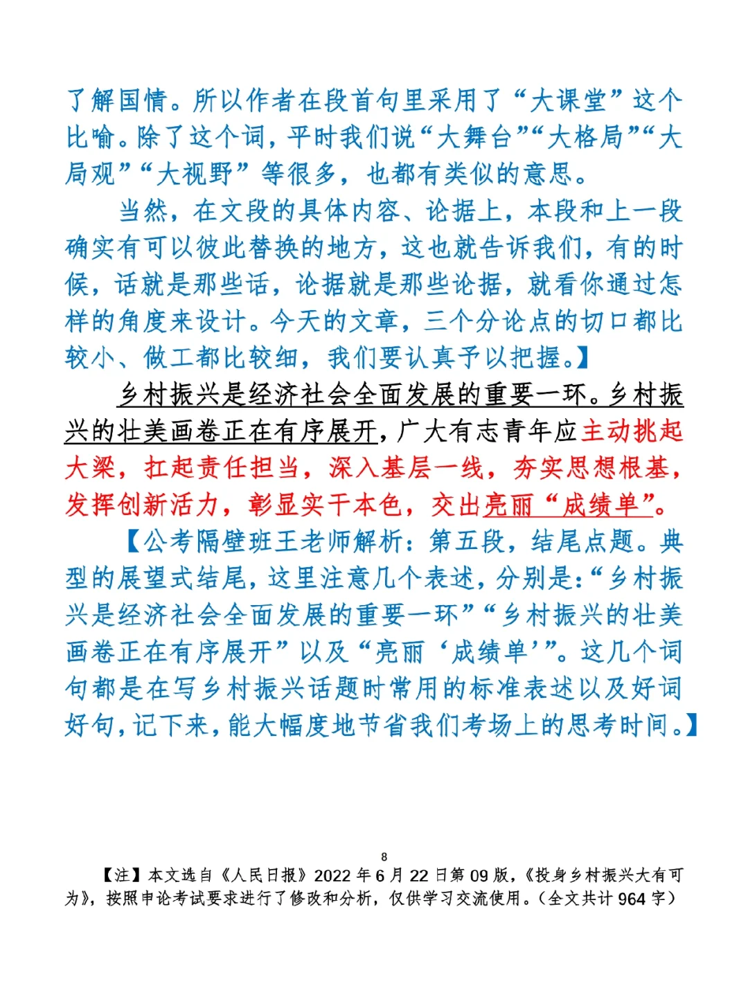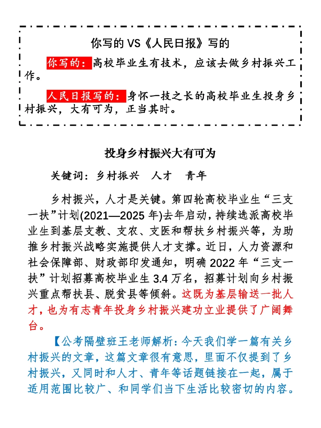 1.如何抄写:每天的抄写文章以图片形式发在“公考隔壁班王老师”账号,红色字是重点句和结构句,黑色字是正文,蓝色字是解析,大家抄写时不必抄蓝色字。建议先通读全文(包括蓝色解析部分),做到心中有数再开始抄写,效果会更好。 2.关于文章:抄写文章来源于人民日报,但每篇文章我都根据申论考试要求进行了修改,主要集中在四个方面:一是重写或修改开头、结尾;二是统一段首句句式结构;三是调整段落字数,使文章结构更均衡;四是简化复杂长难句,使之更具可模仿性。每篇文章修改幅度不同,无论修改多少,都是基于申论考试要求,毫无对人民日报文章品评之意。(此处致敬人民日报) 3.关于解析:我会在文章每段后面加一段蓝色字的解析,是我自己在抄写时的感悟,篇幅时间有限,不能面面俱到,但求重点突出。如果你有其他感悟,也希望能在评论里分享,我们相互学习、共同进步。 ⭐️ ⭐️ ⭐️ ⭐️ ⭐️ ⭐️ 这里是公考隔壁班王老师独创的“每天半小时 申论80分”抄写团,欢迎加入我们!