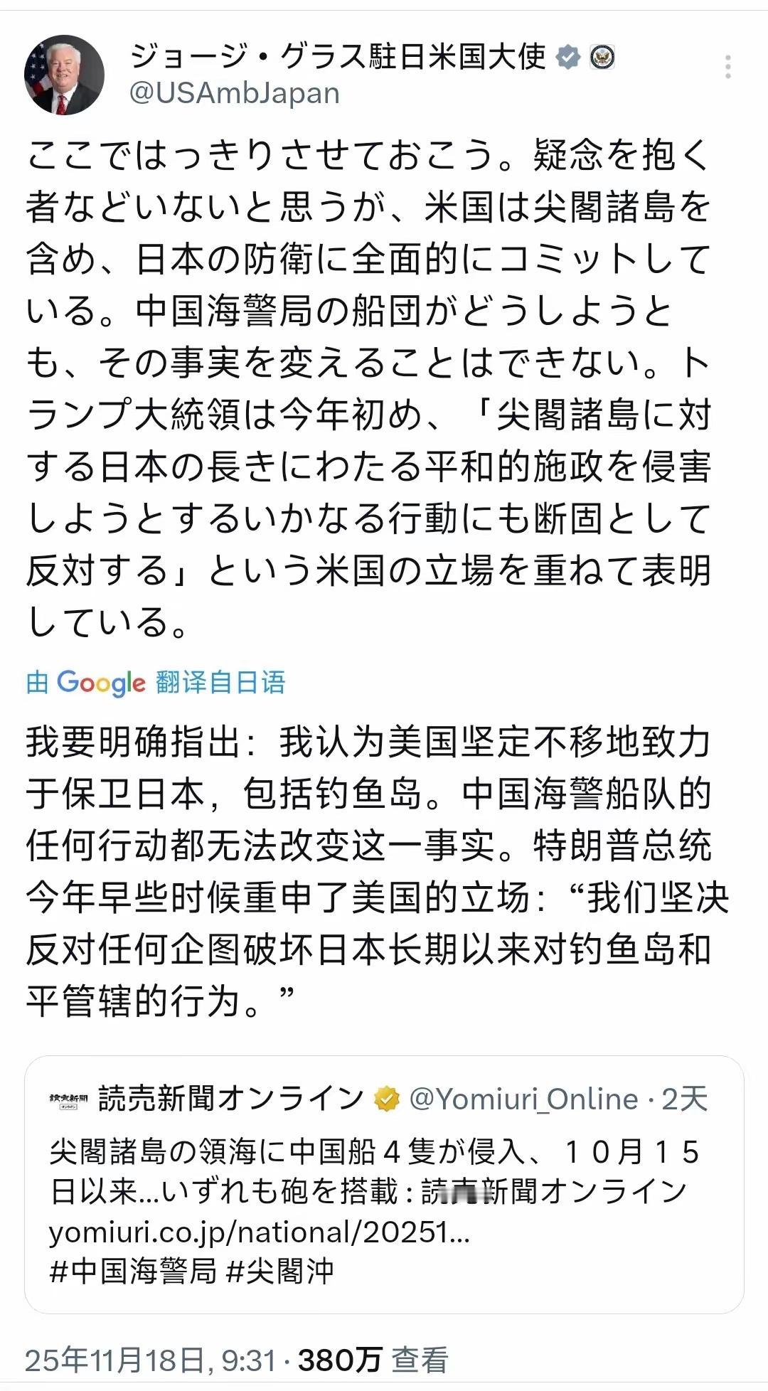 美国驻日大使公然宣称:美国保卫日本,包括钓鱼岛! 美国驻日本大使乔治·格拉斯今天(11月18日)发文写道:“我要明确指出:我认为美国坚定不移地致力于保卫日本,包括钓鱼岛。中国海警船队的任何行动都无法改变这一事实。特朗普总统今年早些时候重申了美国的立场:‘我们坚决反对任何企图破坏日本长期以来对钓鱼岛和平管辖的行为。’” 然而,美国所谓“保卫日本包括钓鱼岛”的言论,纯粹是对中国主权的公然挑衅,是对地区和平稳定的恶意破坏。 钓鱼岛及其附属岛屿是中国领土不可分割的一部分,这有着充足的历史和法理依据。从历史层面看,早在明朝时期,钓鱼岛就已处于中国海防管辖范围之内。中国对钓鱼岛拥有无可争辩的主权,这是国际社会公认的客观事实。 美国打着“保卫盟友”的幌子,实则是为推行其在亚太地区的霸权战略。其在钓鱼岛问题上不断煽风点火,不过是想利用日本遏制中国发展,维护自身在该地区的主导地位。但这种行径注定徒劳无功,中国维护国家领土主权的决心坚如磐石。 中国海警船队在钓鱼岛海域的正常巡航执法,是对国家主权的正当维护,是理所应当之事。美国无权也没有资格对中国的合法行动指手画脚。 美国应认清现实,停止在钓鱼岛问题上的错误言行,回到尊重国际法和国际关系基本准则的正确轨道。否则,其一味挑衅只会加剧地区紧张局势,最终自食恶果。