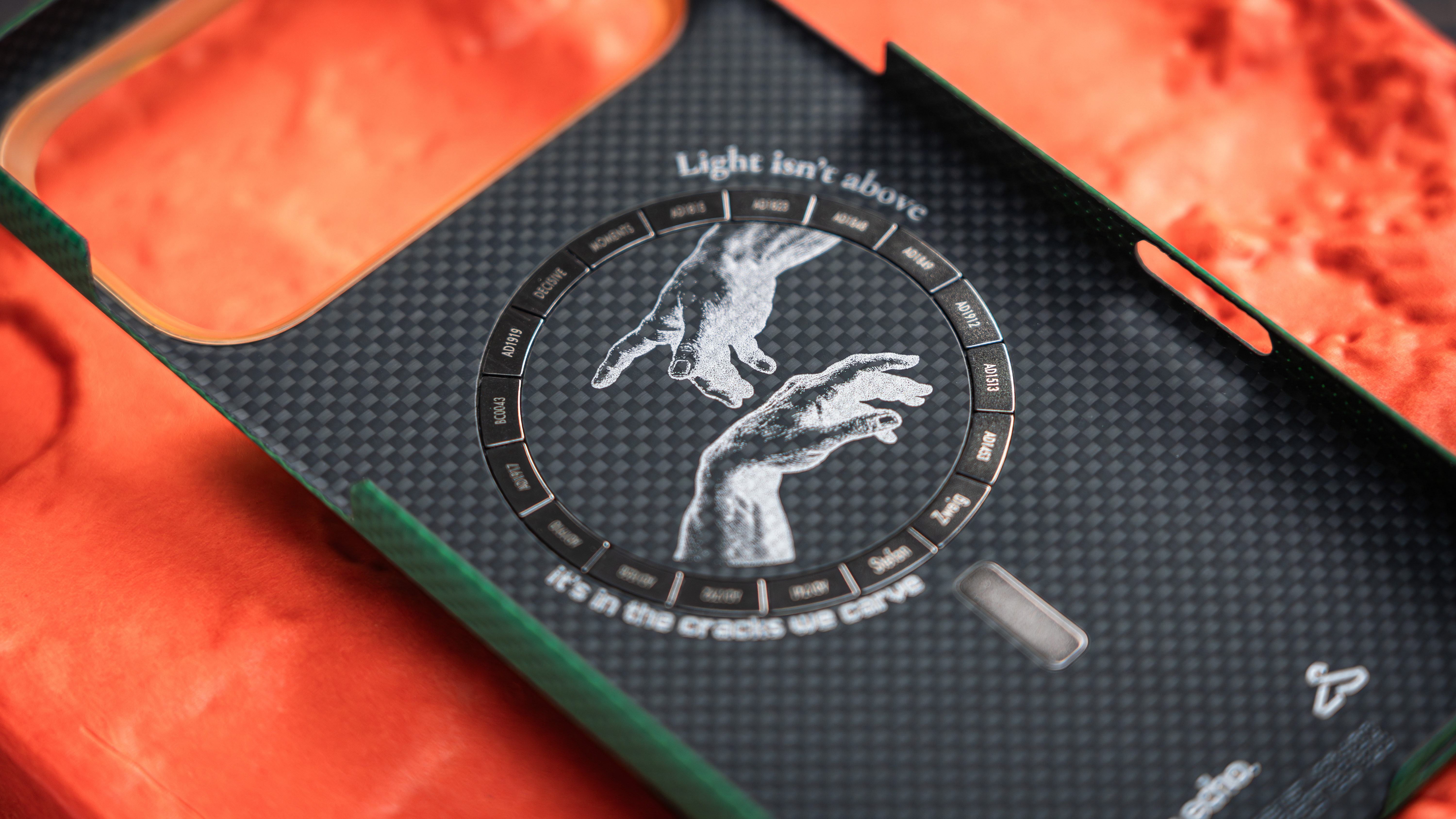 newcloth火星日出新品「士官长:米开朗基罗」做梦也没想过光环能跟忍者神龟放在一起,史诗级关公战秦琼深绿的主色配橙色透明Ultem晶体松脂,颜色正好呼应了士官长的头盔镜片和米开朗基罗的面罩,那不用说这个壳绝配的就是我的星宇橙了。手机壳内部的图案,是那位“人类”米开朗基罗的名作《创世纪》,而且尾磁也回来了,不知道后面会不会再出其他忍者神龟的版本,我先投“达芬奇”一票