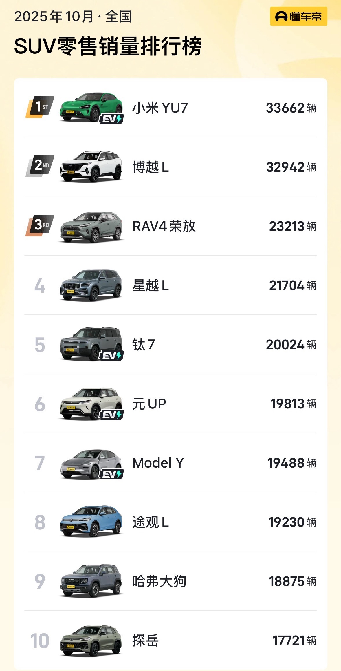 现在SUV月销前5有3款纯油车长城继续猛推哈弗H6L是对的11.99W就能上2.0T加油,把RAV4平替掉,让前5都是中国品牌