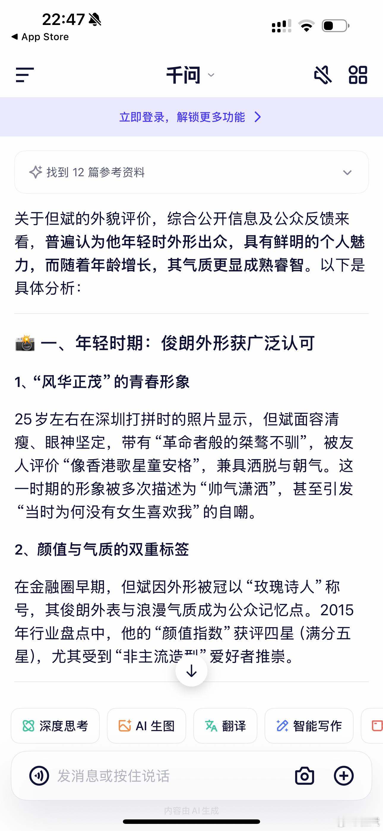 一个朋友说我很像陆挺。结果另一个朋友,到千问上去查我的外貌,很长很长的回答(转发的只是第一页)。而豆包就一句话。千问和豆包的回答差异,可能是两者的定位与思维链设计不同:通义千问走的是“详尽拓展”路线,回答时预判延伸需求,擅长用完整逻辑论证,面对外貌相关查询会补充细节甚至延伸表述;而豆包侧重“精准简洁”,用短思维链直击核心问题,不做过多冗余延伸。阿里的通义千问这种详尽且具深度的输出风格,在需要深度解答、场景化指引的场景里很加分。豆包的简洁高效也适配快速获取答案的需求,两者是不同方向的优化。但从差异化竞争来看,千问的这种特色让阿里在大模型的细分优势领域站稳了脚,是很突出的竞争力。大模型的竞争,阿里似乎有机会!