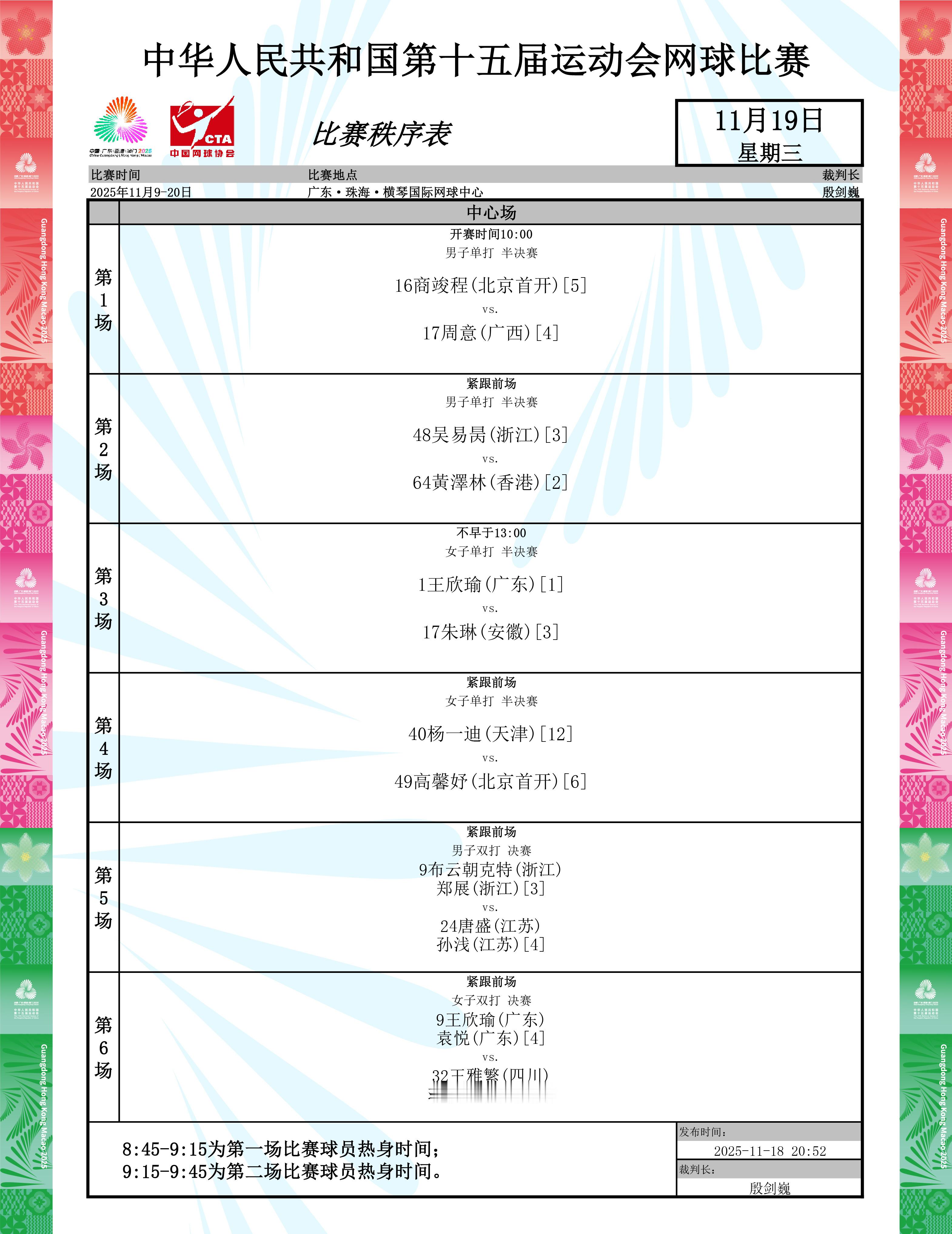 网球11月19日赛程⏰恭喜各位球迷,从广播时代跨进信息时代,所有比赛都有直播信号了