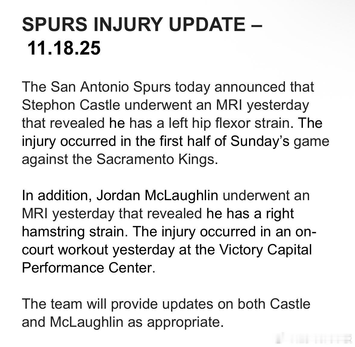 又伤一人!马刺官方宣布,乔丹-麦克劳林遭遇左髋部拉伤和右腿筋拉伤,球队将在适当的时机发布麦克劳林的伤病情况。麦克劳林本赛季出战8场,场均3.5分1.3助,投篮41.7%