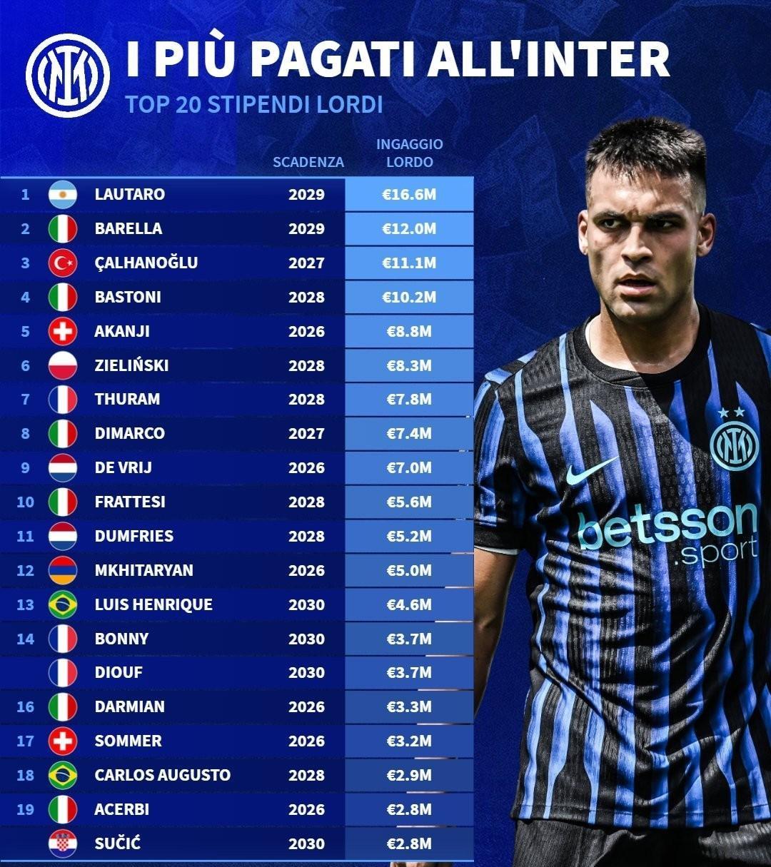 谁最具性价比?德转统计出了本赛季国际米兰税前年薪排名前20的球员,劳塔罗以1660万欧元高居第一,巴雷拉1200万欧元第二,恰尔汗奥卢1110万欧元第三。 看完这个排名,感受如下: 3.队长劳塔罗,队副巴雷拉工资处于前两位,巴雷拉工资还算合理范围内,说实话,以国米前几年的财力状况,能给劳塔罗这么高工资也真是良心俱乐部了,希望劳塔罗能对得起他的工资,带领国米赢下更多的冠军。 大家还觉得谁的工资给高了,谁的又给低了呢? #国际米兰# #国米# #国米球员# #国米球员身价#