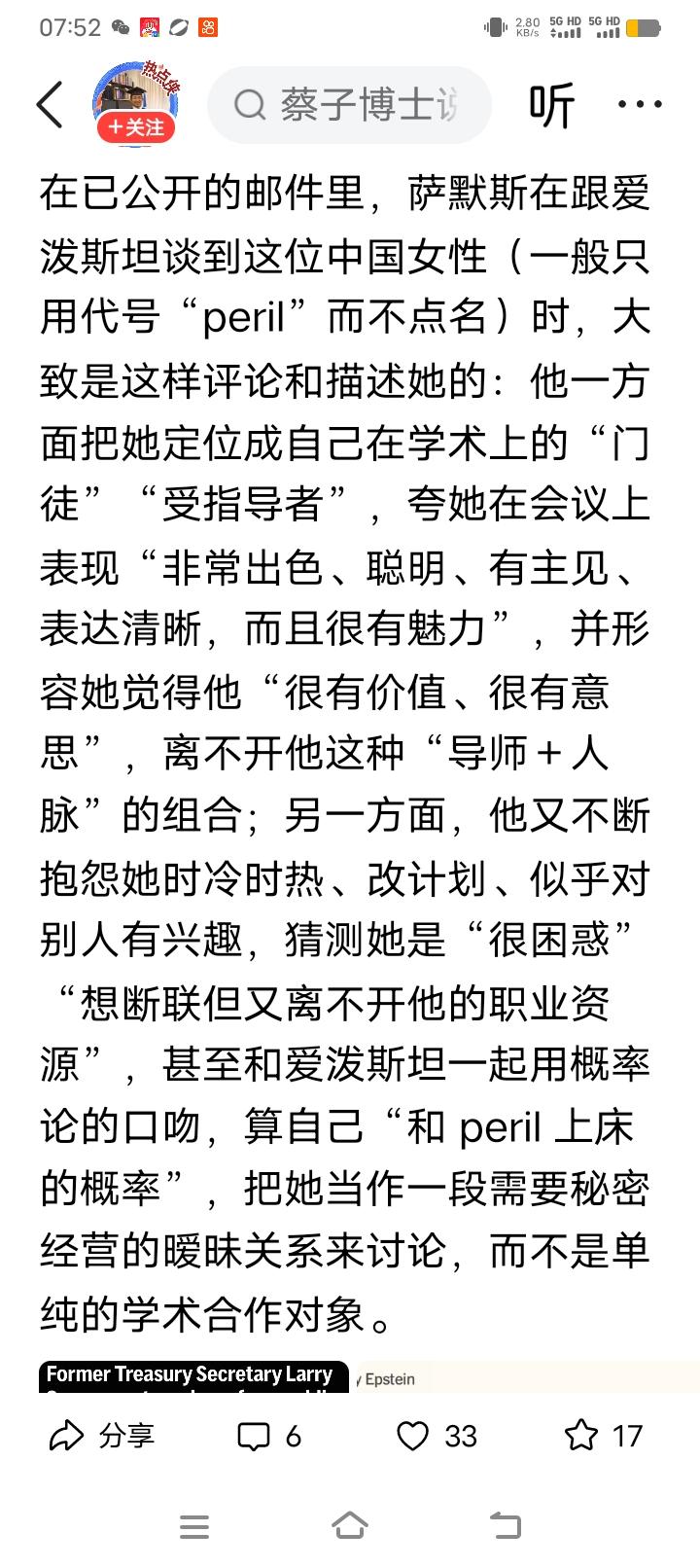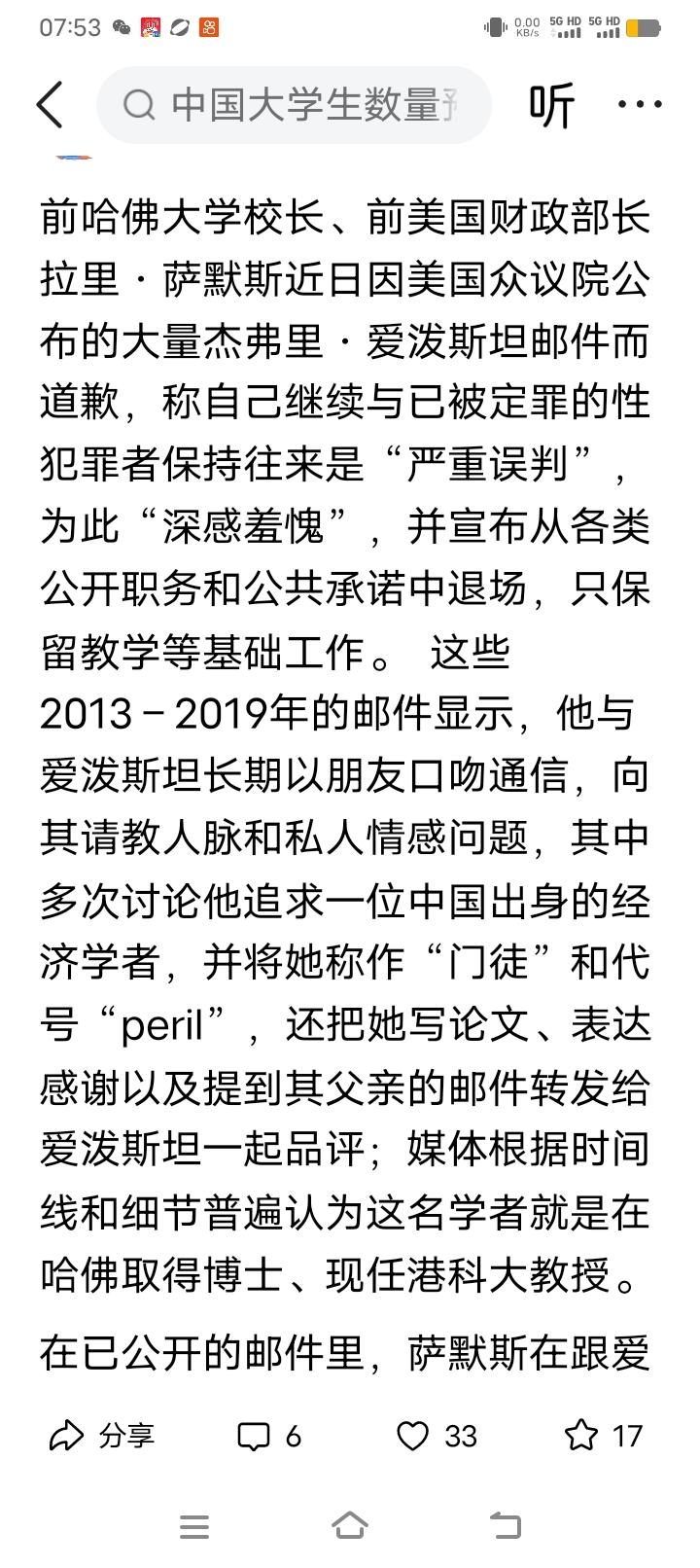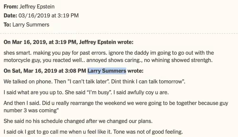惊天大瓜:大家都能猜到爱泼斯坦与萨默斯口中的“她”是谁! “她”父亲影响力巨大,博士毕业于哈佛,现任港科大教授。 原来这位美国前财政部长还是一个“恋爱脑”,明显是被“她”迷得神魂颠倒。 问题是,凡是和爱泼斯坦扯上边的,这里面都意味着某种说不清道不明的蹊跷和邪性。你说呢?