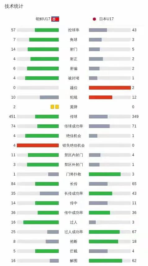 朝鲜U17惨遭日本U17淘汰,常规时间朝鲜U17和日本U17队1比1战平,点球决战,朝鲜队第二位主罚队员点球被扑,日本队5罚全中,最终日本U17点球5比4淘汰朝鲜U17队,朝鲜输得太可惜了,朝鲜队止步U17世界杯8强。 朝鲜队全场比赛控球射门全占优,数据基本是碾压日本队,朝鲜控球率57%,全场狂轰14次射门,可惜临门一脚欠佳,常规时间点球也不进,日本队全场仅5次射门,恭喜日本队闯进U17世界杯8强,日本队也是亚洲唯一一支进入8强的球队,日本队1/4决赛的对手是奥地利队,希望日本队能再进一步,为亚洲足球争光。