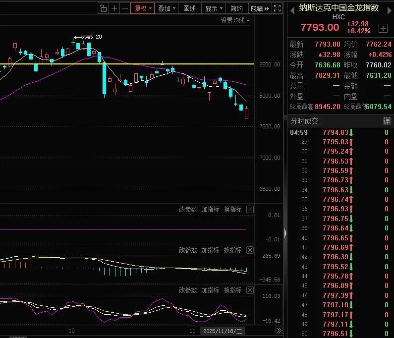 美股持续调整,道指,标普500指数4连跌,技术上,日线走ABC调整。美股调整科技股领跌,英伟达自高点跌超10%,周三盘后财报是关键。最近美股对于英伟达,AI科技,泡沫,估值,做空的消息较多,科技股压力明显。而之前每一次化解这种担忧,靠的是强劲的财报,英伟达的财报很关键。与此同时美股英伟达映射的A股中际旭创,新易盛,天孚通信,胜宏科技,工业富联也是高位持续大跌调整。当前A股科技股也面临资金回流的窗口期,高位爆炒地图,名字,涨价,调整,资金回流科技,但目前没有选择硬件光模块方向,选择低位的AI应用方向。接下来英伟达,财报,表现,直接关系A股这一众科技股表现。值得注意的是周二,美股的中概股低开高走,超跌反弹走势,今天港股,A股正向刺激,超跌反弹修复预期。