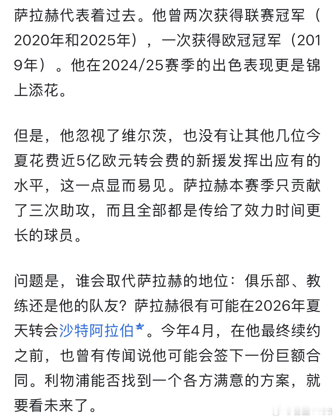 国家队比赛日前后,从纳格尔斯曼到体图资深记者,都在给维尔茨造势,这也就是所谓的足球大国户口本的优势。后者说萨拉赫在场上不尊重维尔茨,而维尔茨保持了忍让。甚至是说24/25赛季利物浦夺冠,萨拉赫的作用是锦上添花。这可把我一个曾经被萨拉赫人迷骂过无数次的“萨黑”给逗乐了。场上的尊重是自己踢出来的,不是靠别人施舍的。萨拉赫跟马内关系一般,但是场上两人还是会有相互喂球,相互传空门。而为什么到了维尔茨这里,别说萨拉赫了,就是琼斯都不给你传空门?24/25赛季你可以指责萨拉赫吸血,数据大于实际贡献,也可以指责萨拉赫拖累欧冠上限。但是说他对于联赛冠军是锦上添花,那这就单纯是为维尔茨上位而写的岁月史书了。