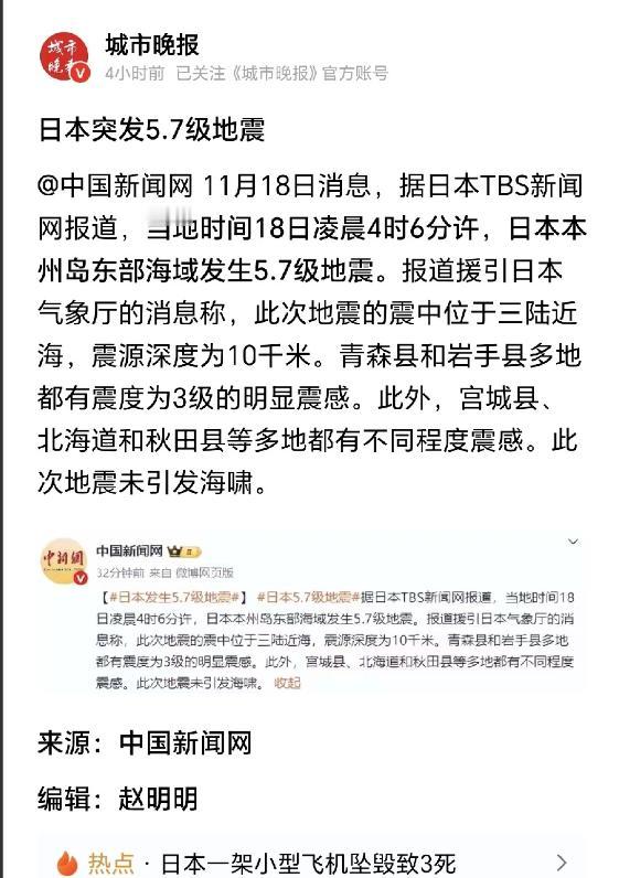 日本出大事了! 18 号这一天日本动静可不小,凌晨 4 点多的时候,本州岛东部的三陆近海先发生了 5.7 级的地震,到了下午 5 点多,青森县附近海域又震了一次 4.7 级的,而且同一天樱岛火山还喷发了,这一天看起来很热闹。 先说说凌晨那次主要的地震,震源深度才 10 千米,这叫浅源地震,能量释放特别集中,虽然震级不算那种毁灭性的强震,但地面上的震感特别明显。 青森县和岩手县那边好多人都感觉到了,震度达到 3 级,啥概念呢?就是你要是正躺着睡觉,能被直接晃醒,屋里的碗碟、杯子会撞得叮当响,灯也会跟着晃,那种晃动是实实在在能感觉到的,不是轻微的颤一下。 除了这俩地方,宫城县、北海道、秋田县这些周边区域也有不同程度的震感,只是没那么强烈而已。 但是最让人担心的海啸没发生,日本气象厅很快就确认了,说这次地震达不到引发海啸的程度,而且虽然震中在海里,但海底没出现大规模位移,这一点真的太关键了,要是引发海啸,沿海的人可就麻烦大了。 还有个让人放心的消息,到目前为止,不管是官方还是媒体,都没说有人伤亡,也没报道房子塌了、道路断了这种重大损失,说白了这次地震主要就是大半夜把人吓醒了,没造成实质性的严重破坏,这已经算是不幸中的万幸了。 下午那次 4.7 级的地震规模更小,震源深度 40 公里,比凌晨的深不少,所以震感也弱,最大震感也就 3 级,影响范围更小,基本没掀起什么波澜,也就是当地气象厅记录了一下情况。 巧的是同一天上午 7 点多,樱岛火山还喷发了,烟柱都喷到 900 米高,这地震加火山喷发凑一块儿,看着确实挺唬人的,但懂行的专家说了,这次凌晨的 5.7 级地震就是板块正常释放应力,属于常规活动,短期内不太可能发生更大的地震,这么一说倒也让人松了口气。 为啥日本老爱地震呢?这跟它的地理位置脱不了关系,那地方正好卡在太平洋板块和北美板块的交界处,地壳板块一直在运动,要么挤要么蹭,一有动静就容易引发地震,所以日本常年都有大小地震,当地人应对地震的经验也比咱们丰富。 就说这次,地震刚过,日本气象厅立马就发布了通报,把震级、震源、有没有海啸风险说的明明白白,没让民众瞎猜。 老百姓的反应也挺稳当,被晃醒了没乱喊乱跑,先摸手机看通知,在小区群里问问邻居情况,有的穿衣服下楼检查一下燃气、电源,看看家里的柜子、花盆有没有倒,整体没出现恐慌,这都是常年应对地震练出来的。 不过官方还是提醒了要警惕余震,毕竟浅源地震之后可能会有小的余晃,让大家在家多留意燃气阀门,出门别往广告牌、危墙底下走,这些提醒也挺实在的。 说起来日本这地方,常年被地震、火山围着,不过他们应对这些灾害的准备比较足,不管是建筑抗震标准还是民众的应急意识都挺到位,不然就这次浅源地震的震感,换个没准备的地方,说不定就得有东西摔碎、墙体开裂了。 咱们从新闻里看这些消息,一方面是了解情况,另一方面也能多学点应急知识,比如真碰到地震,先判断摇晃强度,别慌着跑,先躲在结实的桌子底下,等晃完再检查燃气电源,这些经验说不定啥时候就能用上。 总的来说,这种中等规模的地震对日本来说算是常见情况,就是赶在同一天集中出现,才让人觉得 “出大事了”,实际上就是一次常规的地质活动。 参考资料: 日本发生5.7级地震 多地震感明显 2025年11月18日08:54 来源:中国新闻网