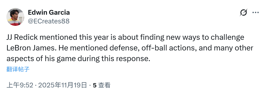 雷迪克表示,今年的目标是寻找新的方式“挑战”詹姆斯,比如防守,无球跑动和其他方面。