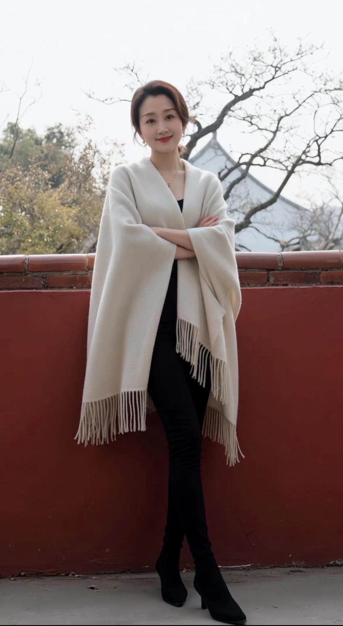 秋日暖阳下的优雅穿搭,米色披肩与黑色裤子的完美搭配,尽显时尚与舒适。
