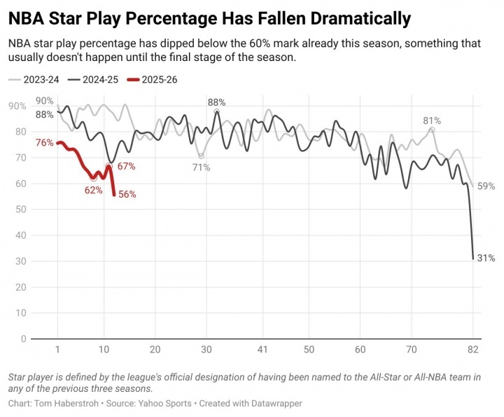 转换多如牛毛,铁打的身躯也会疲劳。记者Tom Haberstroh的统计和分析,本赛季至今,球星们的出勤率已经跌穿了60%,最新的数字是56%。这个数字放在以往赛季,通常是在赛季末段才会出现,本赛季开打还没多久,这一现象令人担忧!据统计,NBA球星本赛季的缺席数量已经超过200场,是2023-24赛季同时段的两倍!NBA球员参赛政策中对球星的官方定义是:在过去三个赛季中至少入选过全明星或NBA最佳阵容的球员。本赛季,共有45名球员符合这一标准,这意味着平均每位NBA球星已经缺席了大约五场比赛。另外,即使排除早就确定将长期缺阵的塔图姆、哈利伯顿、利拉德和欧文,明星球员在赛季首月的出场率也仅为75%,远低于两年前的87%。