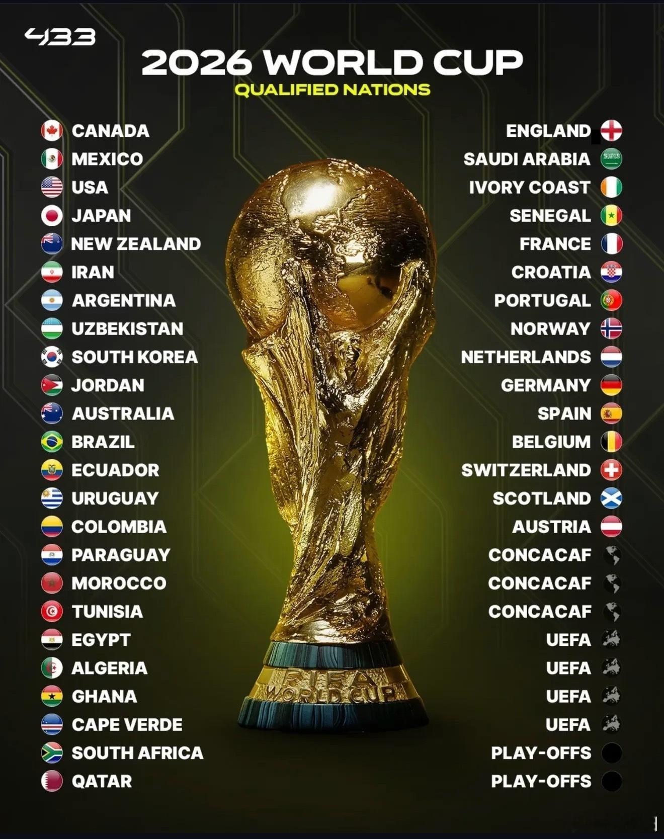 一觉醒来,又有5支欧洲球队取得了明年世界杯的门票。西班牙、比利时、瑞士、苏格兰和奥地利队。加上之前已经获得出线的英格兰、法国、克罗地亚、葡萄牙、挪威、荷兰、德国。已有12支欧洲球队直接晋级世界杯决赛圈。欧洲区附加赛16席支球队也已产生。12个小组第二名:意大利、斯洛伐克、科索沃、丹麦、乌克兰、土耳其、爱尔兰、波兰、波黑、威尔士、阿尔巴尼亚、捷克。4个欧国联成绩最佳世预赛未直接出线球队:罗马尼亚、瑞典、北马其顿、北爱尔兰。 欧洲区附加赛分档如下:第一档:意大利、丹麦、土耳其、乌克兰第二档:波兰、威尔士、捷克、斯洛伐克第三档:爱尔兰、阿尔巴尼亚、波黑、科索沃第四档:罗马尼亚、瑞典、北马其顿、北爱尔兰 欧洲区附加赛抽签将在当地时间11月20日进行,16支球队队伍将分成4组,每组4队进行两场半决赛和一场决赛,最终决出4支晋级世界杯的球队。第一档球队将先在主场迎战第四档4支球队中的一支,如果顺利过关,将会与另一场半决赛(第二档对阵第三档)的胜者争夺一个出线名额。2026世界杯总共48张入场券中,就剩下最后9张还没发出了。