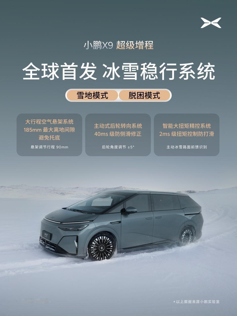 小鹏X9超级增程全球首发「冰雪稳行系统」,冰雪路面不打滑、积雪泥泞可脱困,给北方极寒地区用户带来最强的安心感。小鹏X9超级增程新增「冰雪模式」和「脱困模式」,精准适配北方冬季场景。面对冰雪湿滑路面附着力不足时,「智能大扭矩精控系统」让冰面动力响应更快、脱困劲儿更足,「主动式后轮转向系统」还能大幅减少横向打滑偏移,复杂冰雪路况都能从容应对!家用大车的终极豪华,从来都是稳稳的安全!