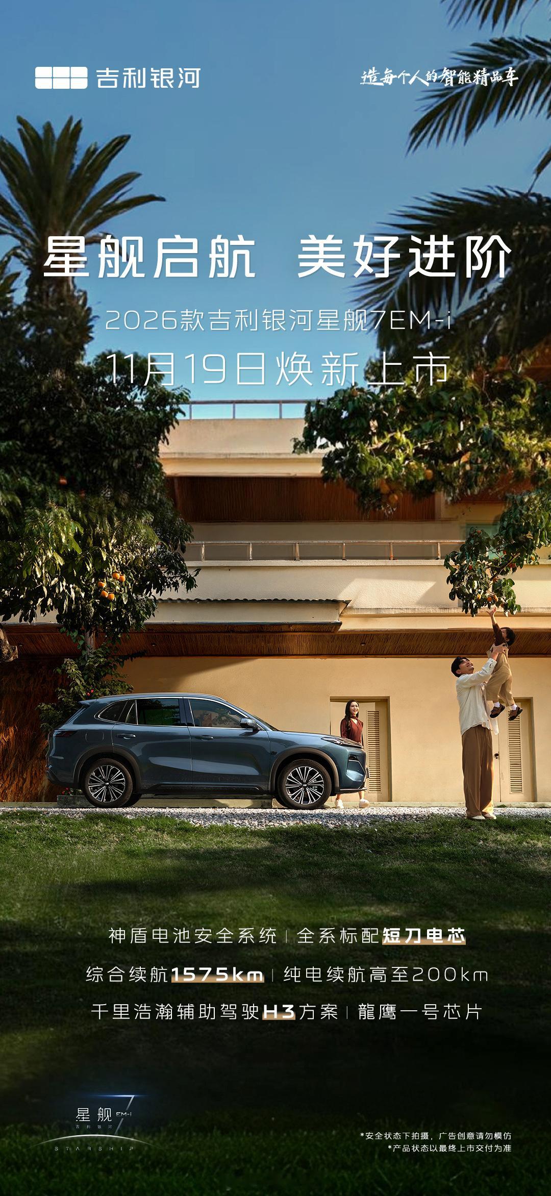26款吉利银河星舰7 EM-i 将于11月19日上市。全系标配短刀电芯,搭载全新雷神AI电混2.0和千里浩瀚H3,官方称亏电油耗3.15L/100km,纯电续航150/155km。综合续航1575km。