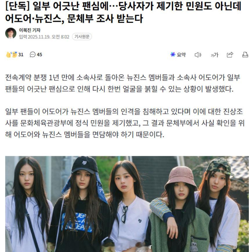 据韩媒,NewJeans宣布回归Ador后,大量粉丝信访韩国文体部,称“ADOR以令人无法理解的行为折磨NewJeans成员”、“ADOR与媒体勾结,制造恶意舆论”、“单方面偏袒某一方制造成员间不和的氛围”等。由于已作为正式信访受理,文体部计划近期约两方面谈。