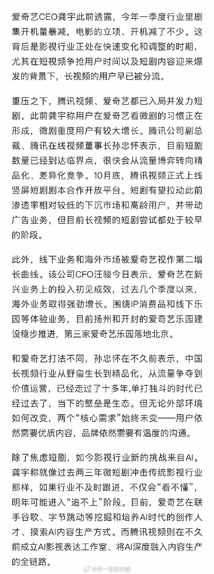 【 , 】长视频的日子不好过。过去,包含了暑期的第三季度往往是长视频行业的旺季,但在短剧等冲击下,长视频在暑期档遭遇挑战。11月18日,爱奇艺(NASDAQ:IQ)发布截至2025年9月30日未经审计的第三季度财报。三季度,爱奇艺总收入为66.8亿元人民币,同比减少 8%。归属于爱奇艺的净亏损2.489 亿元人民币,而去年同期为2.294 亿元人民币;不按美国会计准则,爱奇艺净亏损为1.482 亿元人民币,去年同期为4.798 亿元人民币。(第一财经日报)