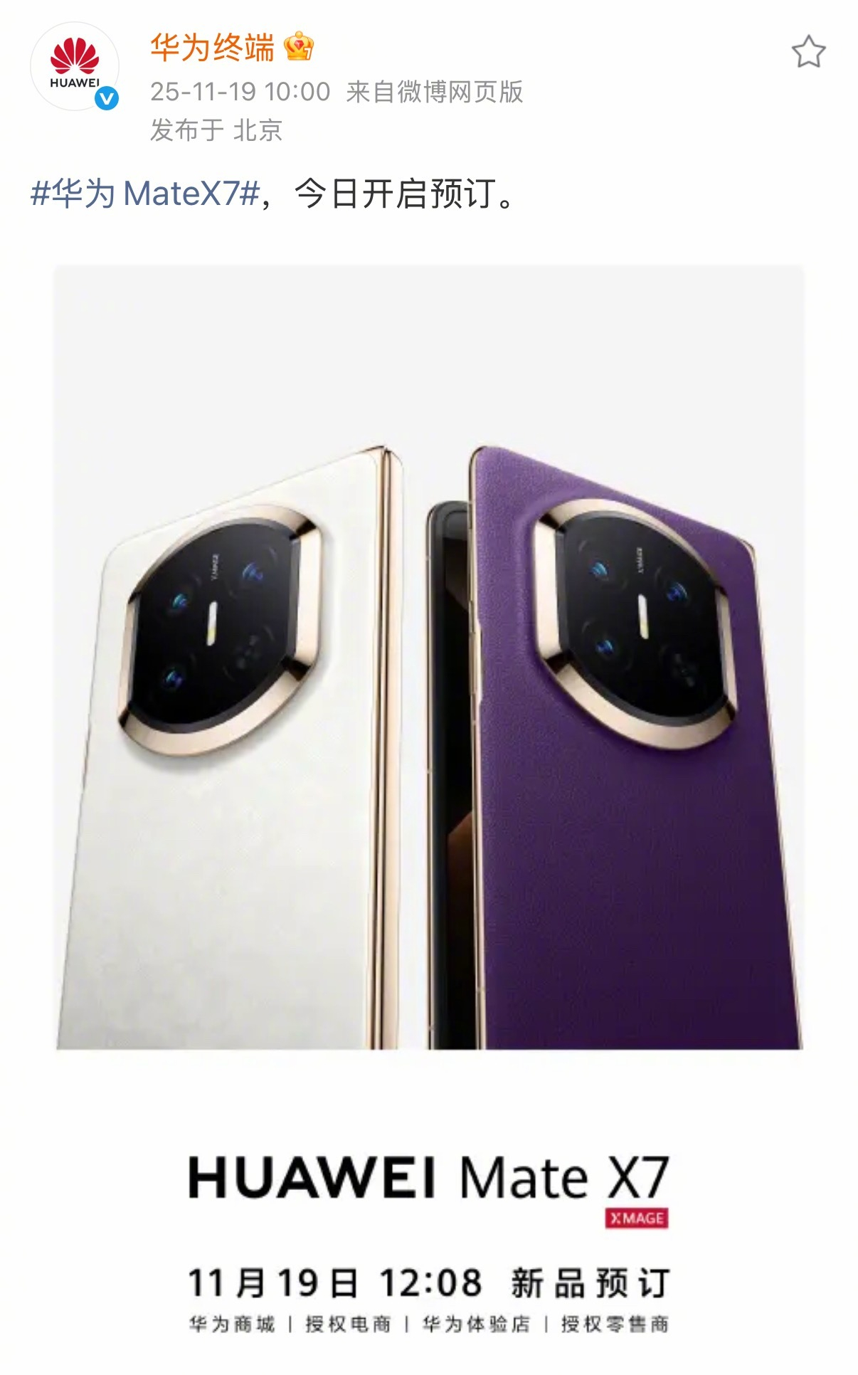 华为 Mate X7主打的玄武架构和红枫影像。下周还有平板电脑、华为 WATCH 非凡大师紫金款。今年的全部产品就都更新完咯,朋友们会想入手哪款?🤔