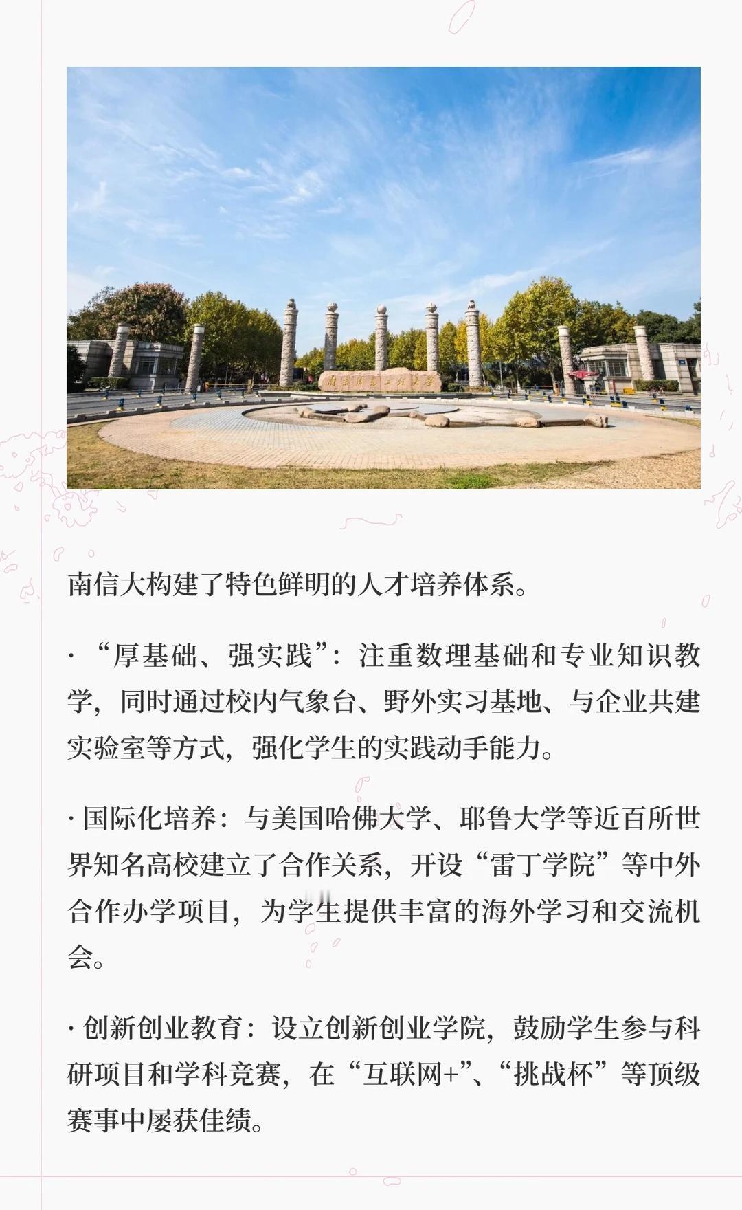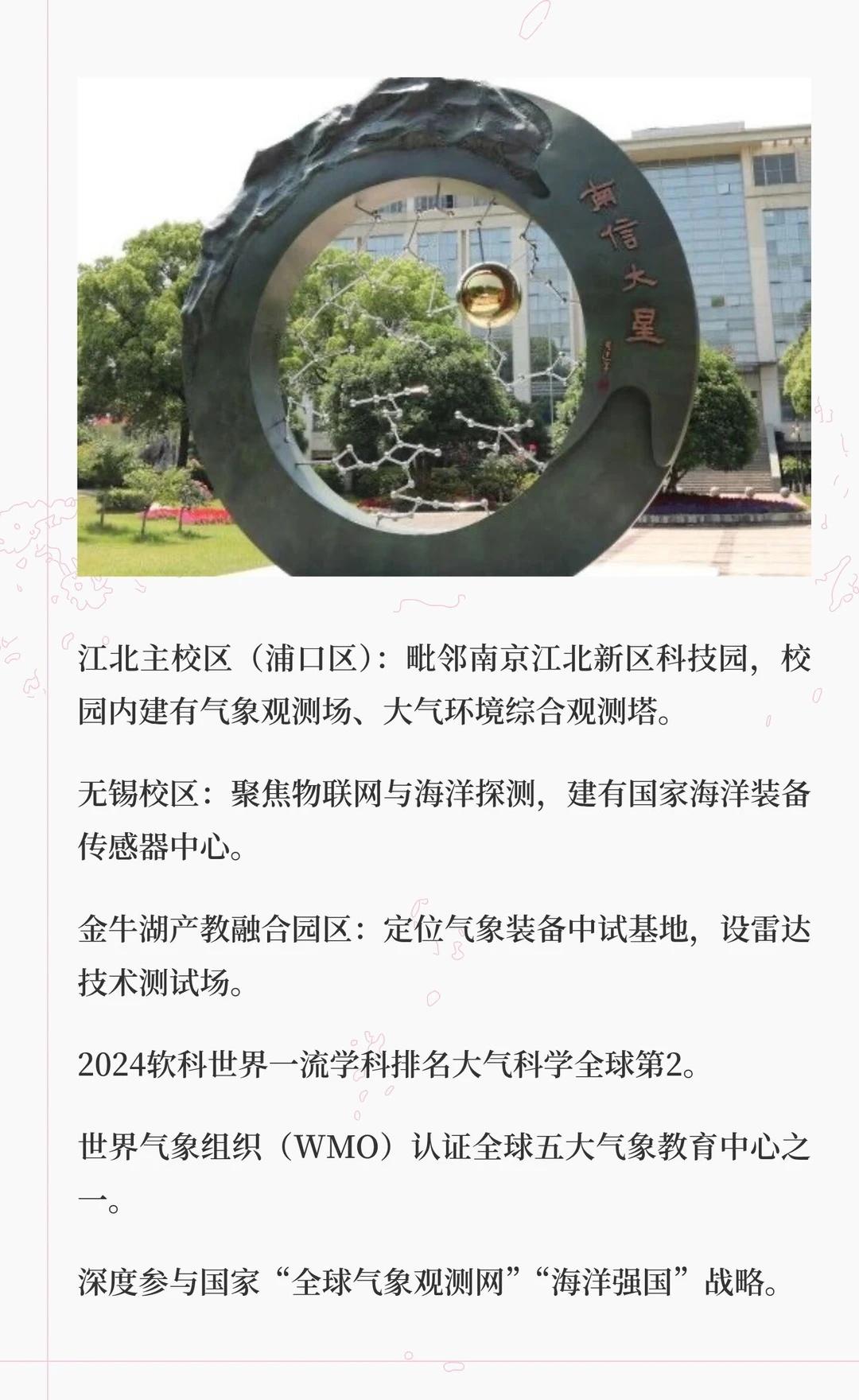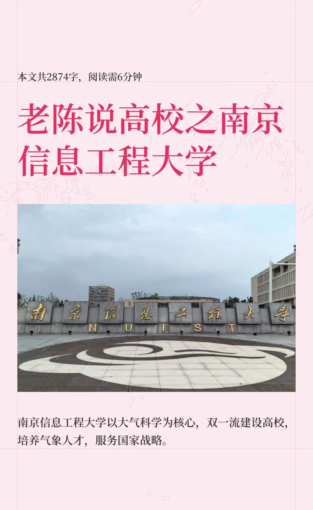 老陈说高校壹佰玖拾捌期之南京信息工程大学 南京信息工程大学,简称“南信大”,是国家“双一流”建设高校,以大气科学为核心,涵盖理、工、管、文、经、法、农、艺等学科。学校培养了大量气象人才,参与国家气象和海洋战略,科研成果显著。高校 大学 院校规划 南京信息工程大学 梦想的大学 别人的大学 向往的大学 院校选择 院校推荐