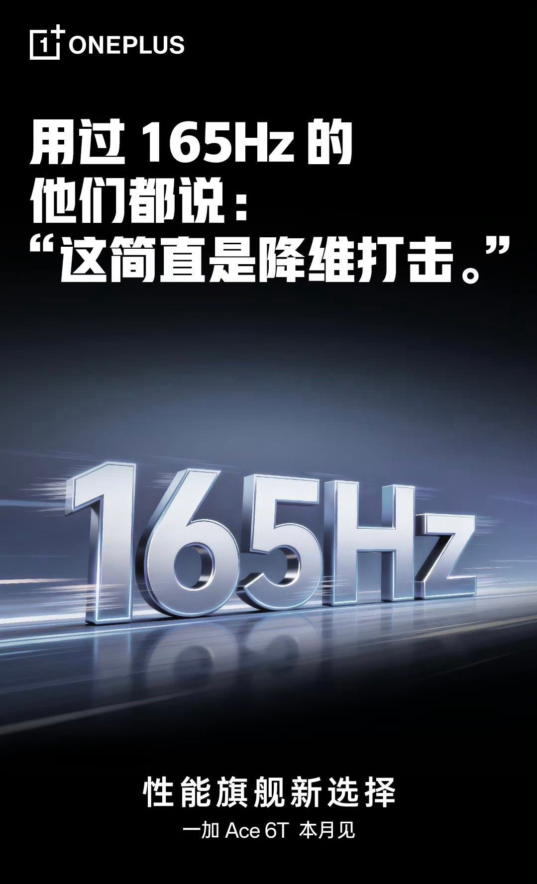一加手机首发搭载,高通第五代骁龙8移动平台,该芯片官宣11月26日发布。应该就是一加 Ace6T首发搭载了,加上165Hz,可以期待下一加 Ace6T