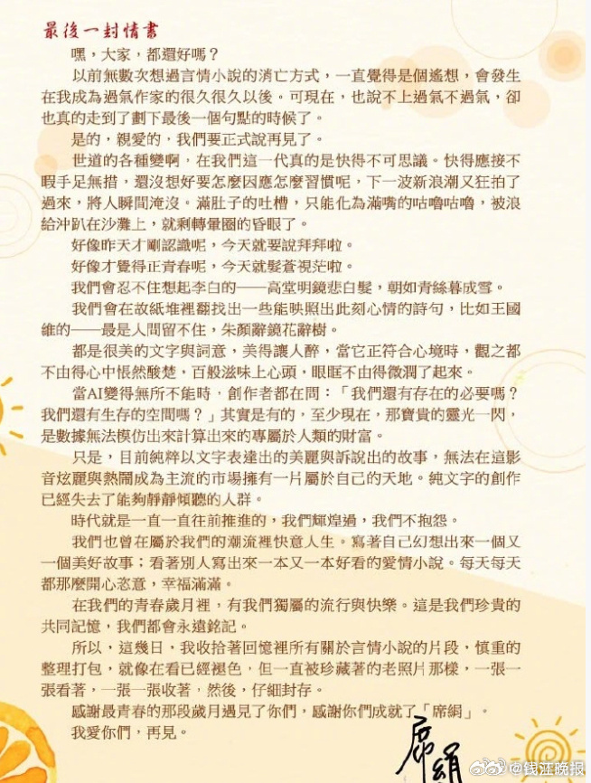 【 】 11月19日,曾写出《上错花轿嫁对郎》的言情小说作家席绢发文告别:以前无数次想过言情小说的消亡方式,一直觉得是个遥想,会发生在我成为过气作家的很久很久以后。可现在,也说不上不过,却也真的走到了画下最后一个句点的时候了。是的,亲爱的,我们要正式说再见了。 (中国蓝新闻)
