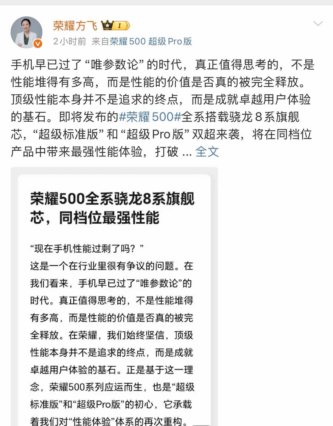 虽然现在确实是性能过剩的时代,但这个过剩还是局限在“旗舰芯片”上!我们不提系统流畅度,就游戏性能,影像硬件、AI这个和性能都是息息相关的!说个简单的例子,部分游戏,很多中端芯片是没有高帧的模式的,这样你就体验不到最好的游戏体验!性能打折扣,体验必然也会打折扣。今天荣耀手机方飞发布小作文再次详细解读中端机性能问题,认为中端机市场虽大,但普遍面临“降配减价”和“性能妥协”的行业现状。这次荣耀500系列全系搭载骁龙8系旗舰芯片,标准版用骁龙8s Gen4,Pro版用顶级的骁龙8 Elite,给荣耀500系列的体验有了一个很好的支撑!荣耀坚持用旗舰配置打造标准版也不是第一次了,前段时间发布的Magic8标准版,标配的IP68+IP69防水、卫星通信等以往Pro版才有的配置,以用户为中心、技术平权、追求极致产品力是荣耀的核心品牌理念,这样的产品绝不会差。发布会越来越近了,大家可以期待一下!看看有没有什么好东西~
