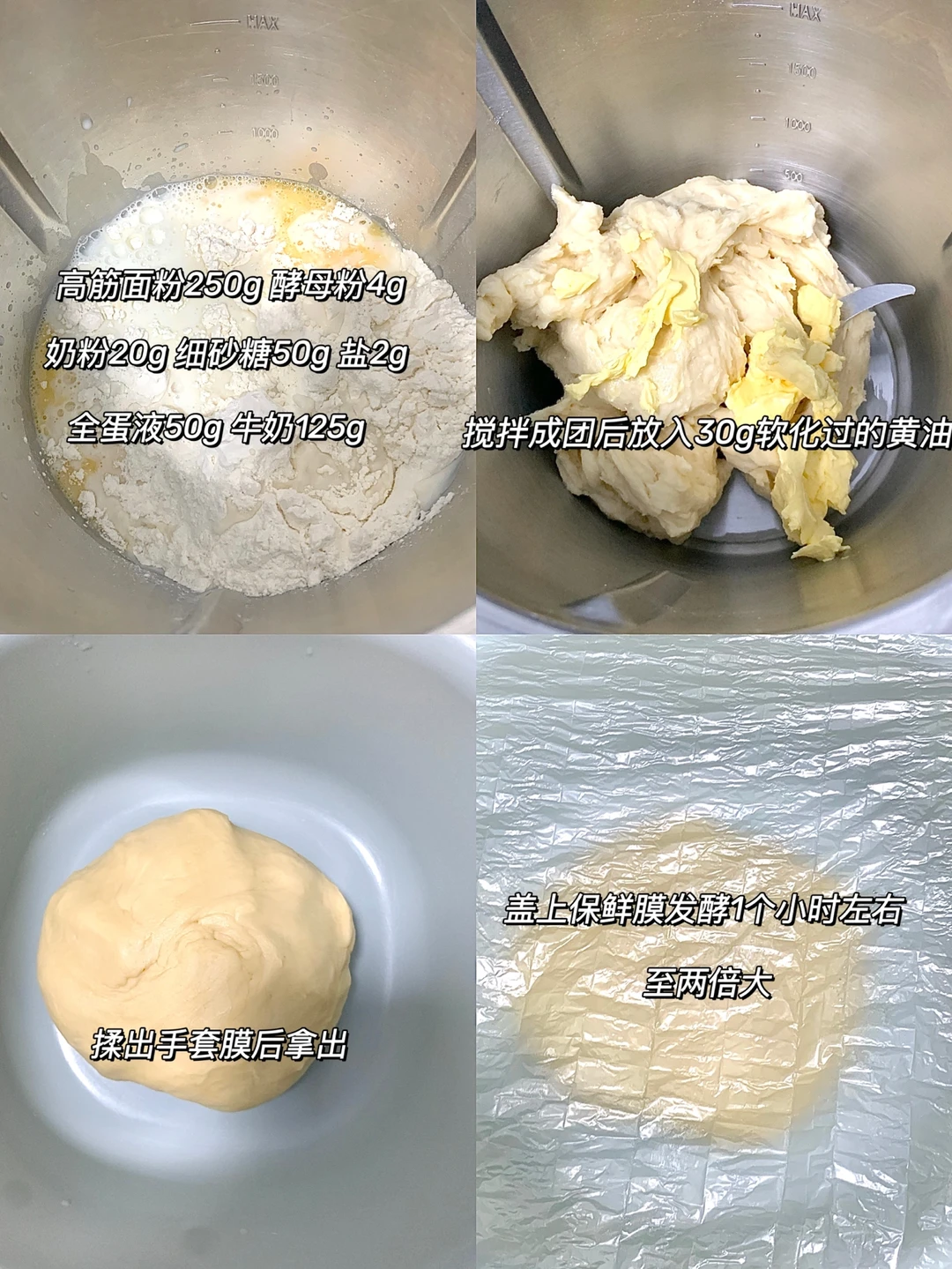 1、烹饪机中放入高筋面粉、酵母粉、奶粉、白砂糖、全蛋液、牛奶搅拌成团后,放入黄油揉出手套膜