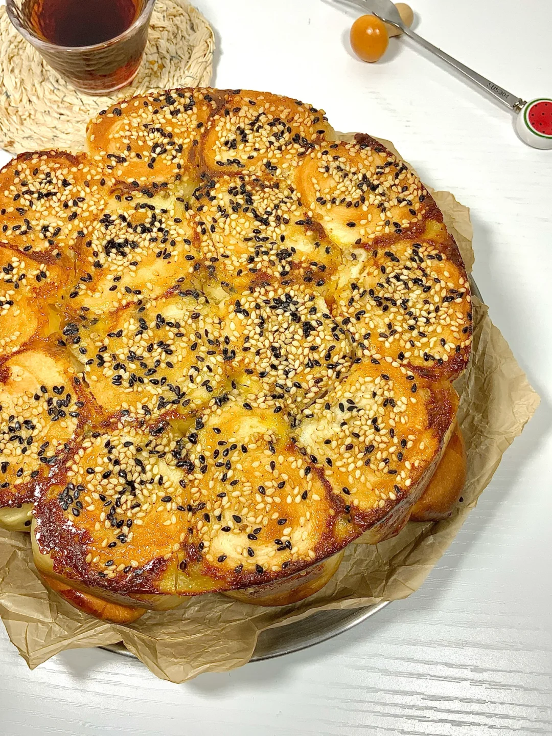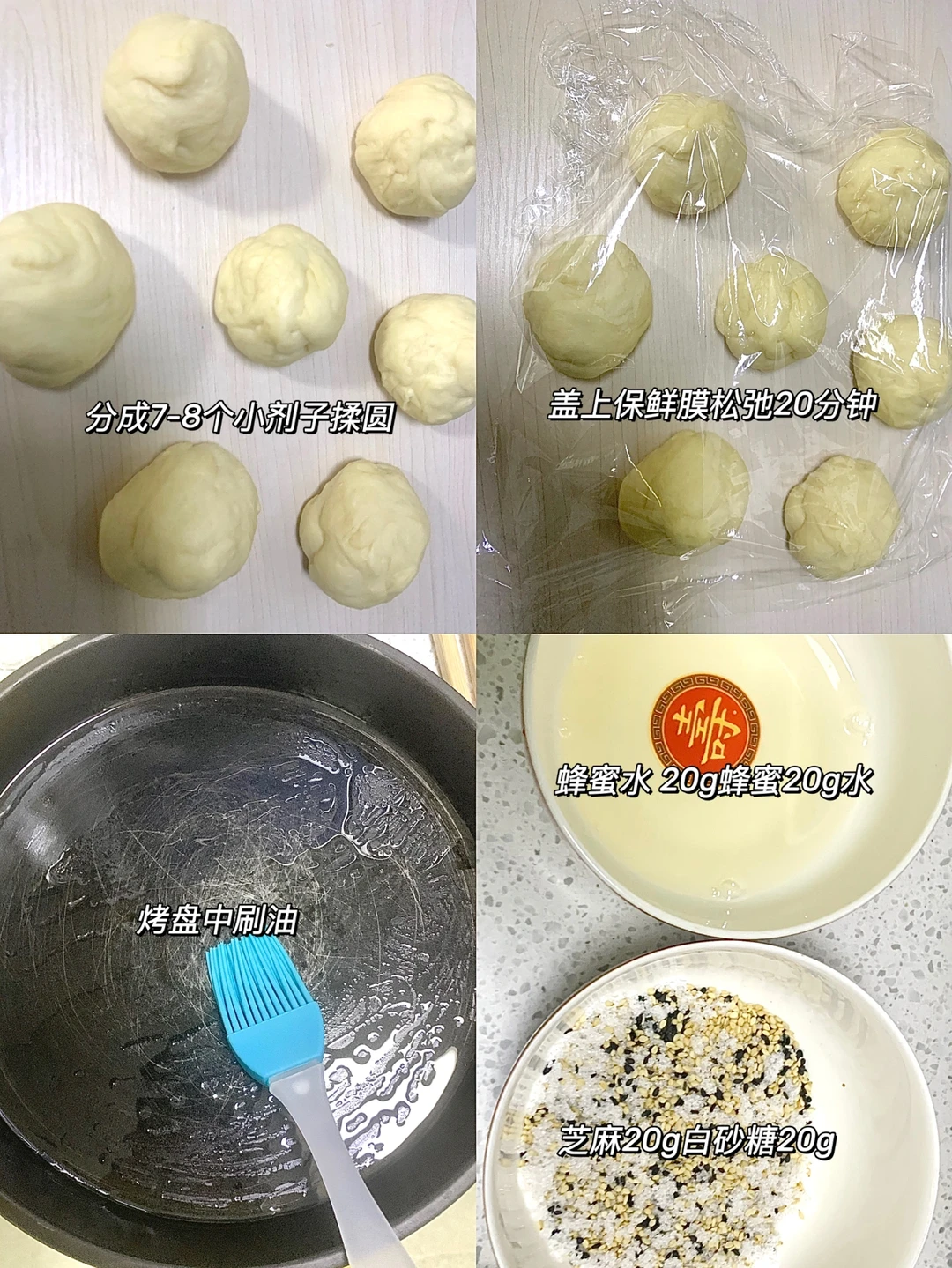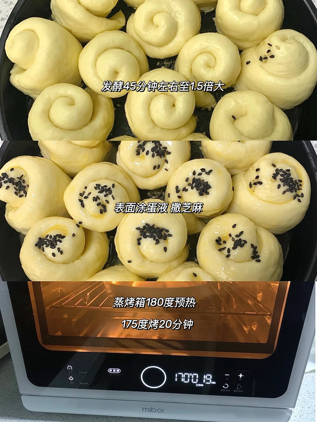 4、均匀放入烤盘中,中间留有间隙, 发酵约45分钟至1.5倍大,表面涂蛋液,撒芝麻