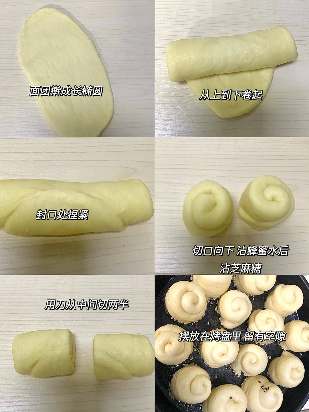 3、烤盘刷油,面团擀开成椭圆形,从上到下卷起来,封口处捏紧,切成一半,切口处先沾蜂蜜水,再沾芝麻糖