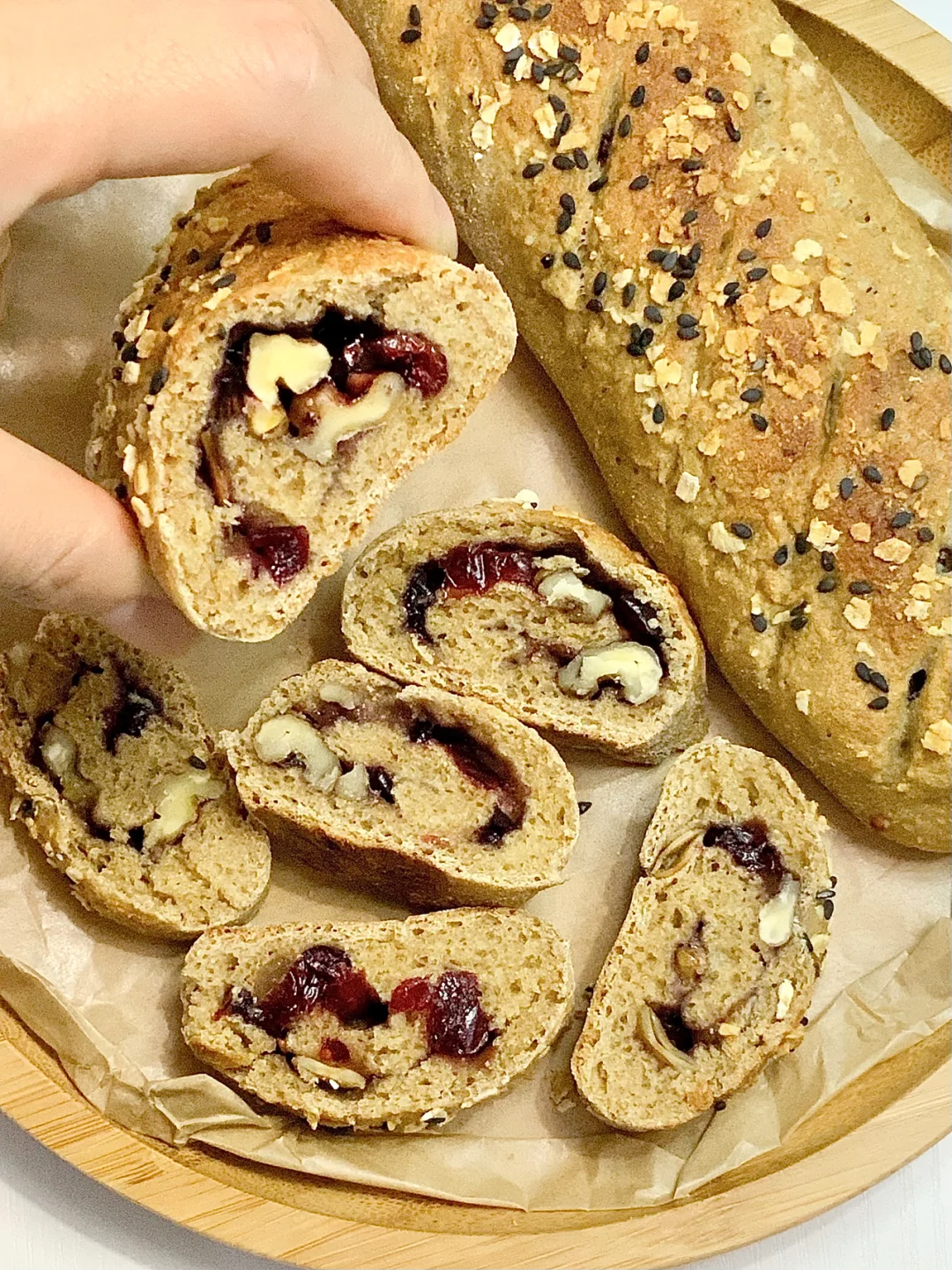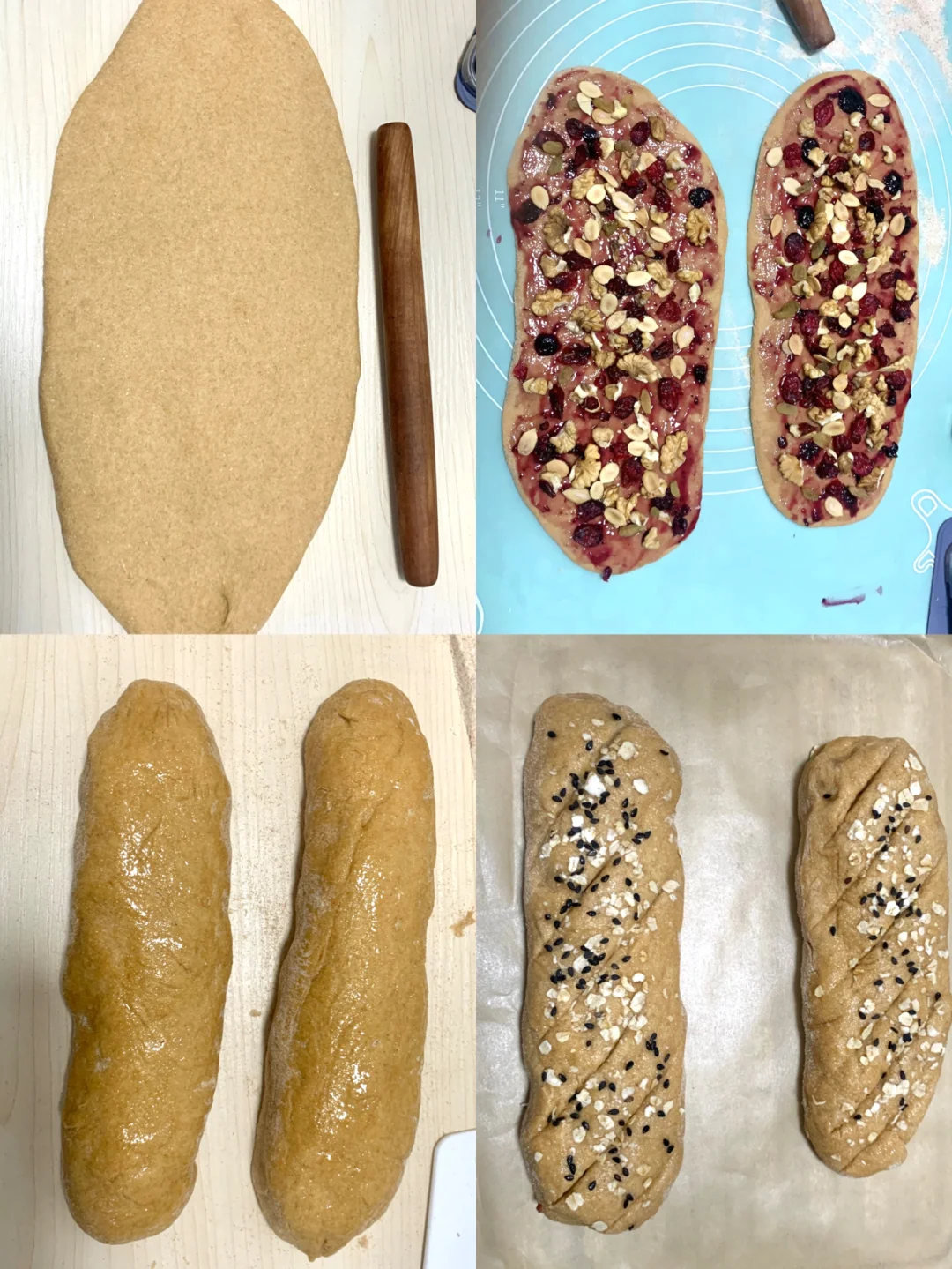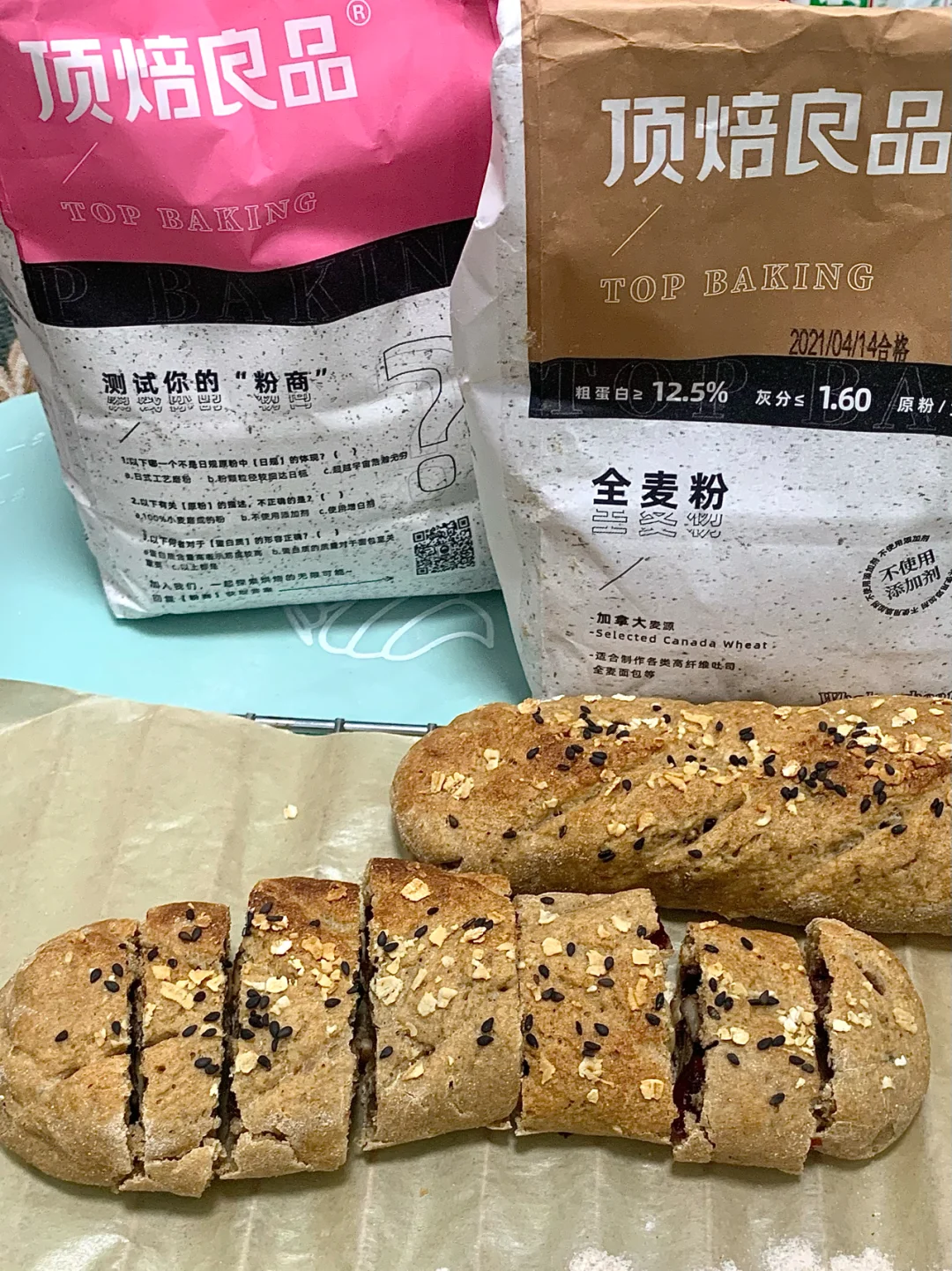零失败😯低脂健康的全麦面包来咯⚠️ 食材篇🥬: 全麦面粉、酵母粉、鸡蛋、各种果干 步骤篇🥣: 1、准备300克全麦面粉、5g酵母、2个鸡蛋、放入少许水搅拌成絮状,再揉搓成团 2、面团盖上保鲜膜醒发至两倍大 3、醒发好的面团擀成长椭圆形,铺满果干 4、从一头卷起,捏紧收口,表面刷蜂蜜,撒麦片黑芝麻 5、用刀划花口后将面包二次发酵至两倍大 6、190度烤箱20分钟出炉✅ - 本期全麦面包用的面粉是烘焙良品全麦粉,含有胚芽的全麦粉,保持整粒的营养,一点面粉也没有添加😯太适合减脂期的姐妹了👭