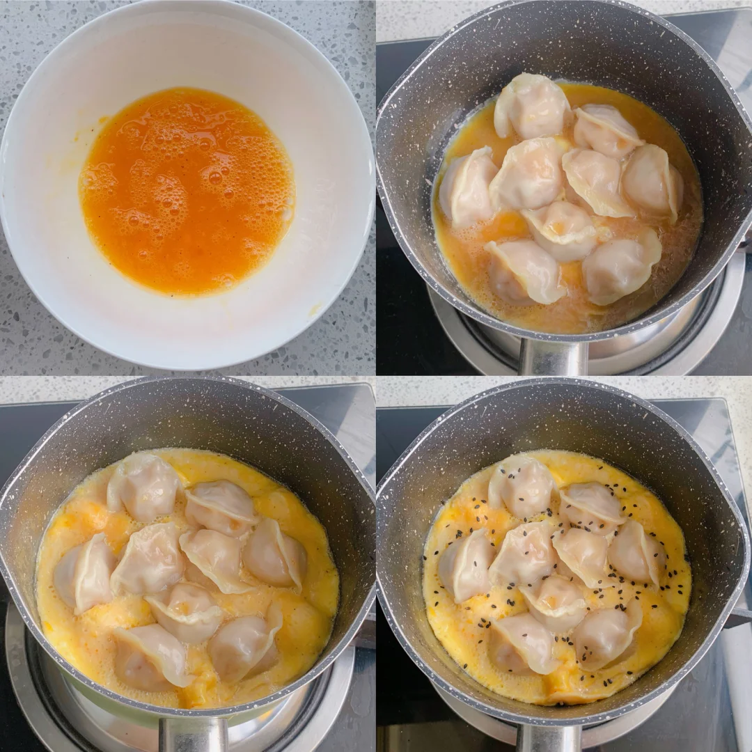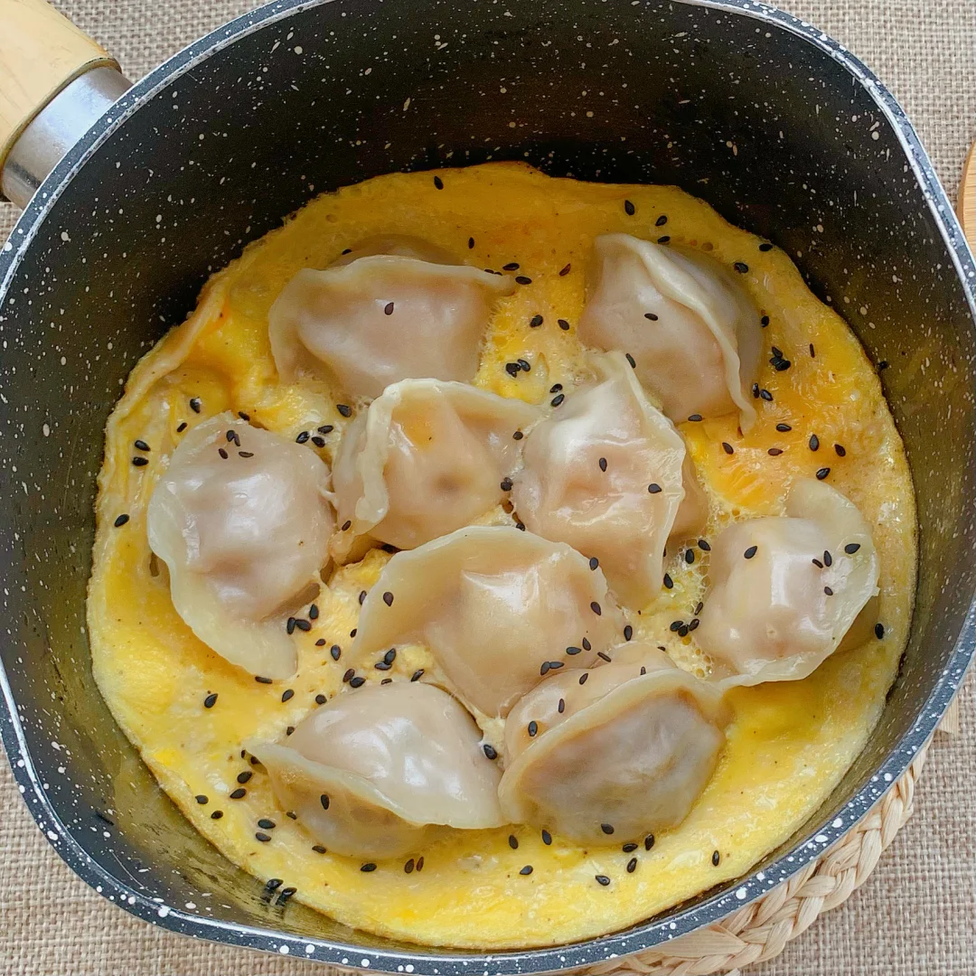 忙碌的早上来一份快手早餐吧🥟简单食材🍳不简单的美味🤫 食材篇🥬: 水饺、鸡蛋 步骤篇🥣: 1、锅中刷油,将水饺放入煎一分钟(我用的速冻水饺懒人必备哈哈) 2、然后加入开水!开水!末过水饺三分之一开水,加盖小火焖煮 3、鸡蛋里放少许盐和胡椒粉打散,煮至锅中就剩一点水时倒入蛋液(从没有水饺的一边倒入,晃动锅子使其均匀) 4、小火小火!煎至蛋液凝固,撒芝麻出锅✅ - 懒人必备的抱蛋煎饺🍳好吃好看🥺