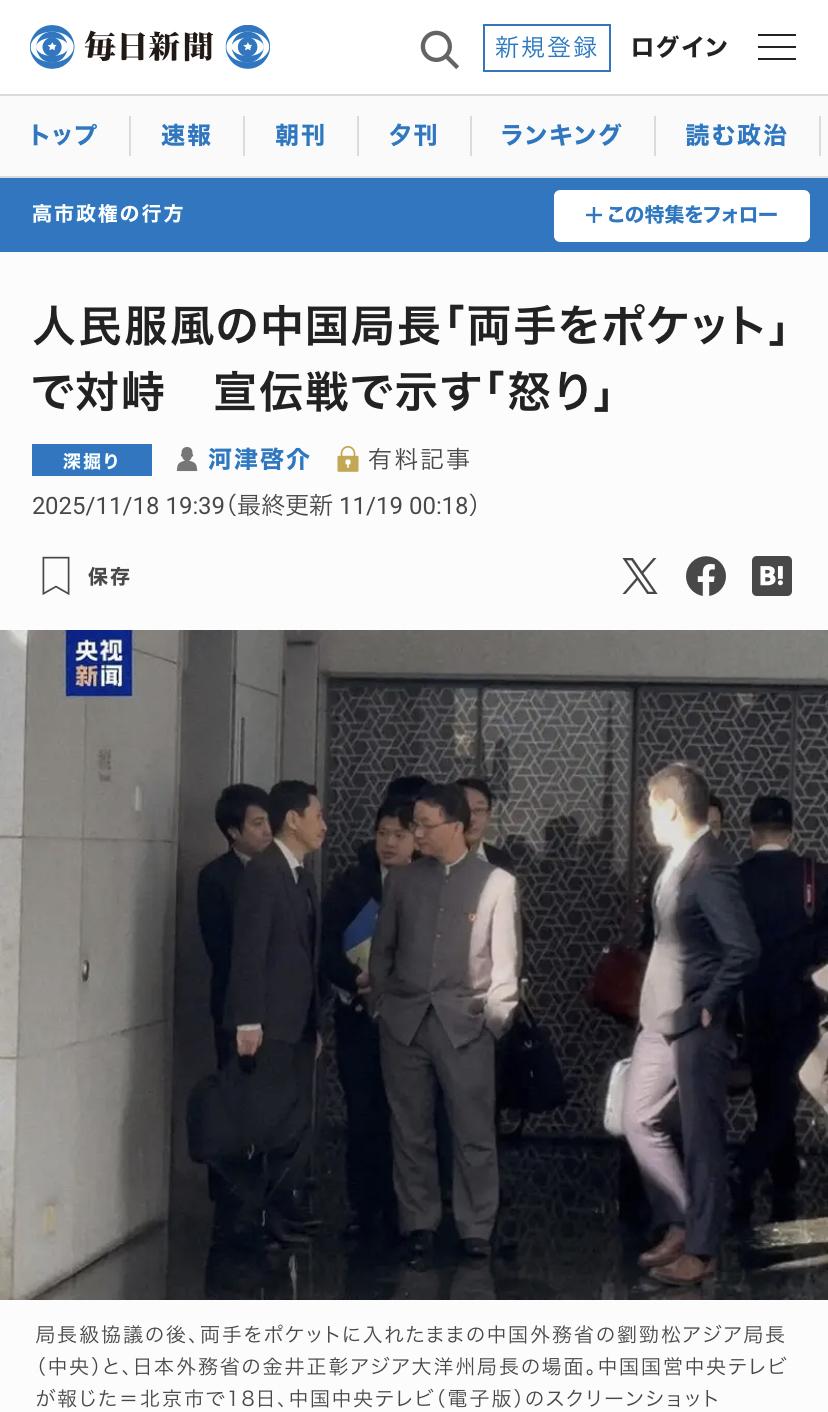 日本认为这是宣传战?[捂脸] 难怪高市早苗拒不撤回涉台言论。 日本大报每日新闻如此报道中日沟通和最近中方对日本的表态,认为这是我们面向国内民众的爱国主义宣传。可见日本对问题的严重性认知和我们有巨大差异。 原文部分翻译如下: 日本外务省的金井正彰亚洲大洋州局长18日在北京与中国外务省的刘劲松亚洲局长进行了协商。围绕高市早苗首相的国会答辩,虽然对台湾有事可以行使集体自卫权的“可能成为存在危机事态”进行沟通,但事态还没有解决的前景。 刘氏双手插在口袋里,表情严肃地与日本方面对峙。与金井先生协商后,中国国营中央电视台敢于报道这样的影像,被视为宣传掌握事态主导权的宣传战的一部分。人民服装风的服装也让人感受到了面向国内的“爱国”信息。 中国政府没有改变要求首相撤回答辩的强硬态度。一边以日本旅行的自我克制呼吁等动摇了高市早苗政权,一边展开了包括官民对日的批评运动,试图控制国内舆论。 “日本的股价大幅下跌”“如果中国游客大幅减少,损失就会巨大”。中国的报道中,一连几日都有这样的头条新闻。中国政府对首相答辩的实际对抗措施,似乎有让国内外知道对日本的“打击”,为了证明本国的应对是正当的目的。