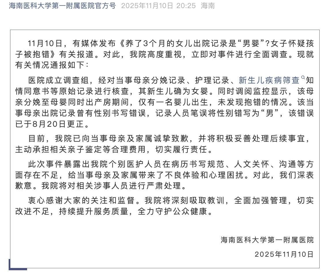 养了三个月的女儿出院记录显示是男婴,近日医院已经回应女子怀疑抱错孩子一事。 近日,海南一位网友在网络平台发布视频,视频中称女儿已经三个月了,但是整理住院期间的材料时突然发现,生孩子时医院的出院记录登记为男婴,该女子一度以为自己抱错了孩子,女子随即找到医院,医生称只是工作失误打错了,改一下就行。并没有过多的解释。 后来女子将此事发布到网络,记者到达该医院时,负责接待的的工作人员称,医院有完整成熟的工作流程,在当下没有抱错孩子的可能性。如果持续对结果产生怀疑,可以做亲子鉴定,医院会承担亲子鉴定及其相关费用和该付的法律的责任。 事情一经发出,引发不少网友的关注和不满,多数网友表示建议女子做一个亲子鉴定,并对医院这种处理事情的态度表示不满,医院并没有站在一位父母的角度去考虑问题,只是愿意出费用承担责任,可是对婴儿父母的心理没有实质考虑。 11月10日,海南医科大学第一附属医院发布通报,称已经调查确认,当时的出院记录是工作人员笔误造成。目前该错误已经更正。对当事人致歉,并对相关涉事的工作人员已经严肃处理。 孩子是每一位父母的心头肉,关于孩子的事没有小事,医院有责任有义务在这些事上做到万无一失!!!