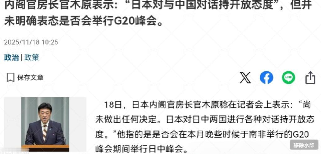 日本出来回应了!在我们明确宣布G20峰会期间没有与高市早苗的会晤安排之后,日本出来回应了!11月18日,日本内阁官房长官木原稔在记者会上表示:尚未做出任何决定。并称,日本对日中两国进行各种对话持开放态度。他还透露,将于18日在北京举行的日中局长级磋商是双方定期举行的磋商。上次是在日本举行,所以这次将在北京举行。   日本这通表态,看着云淡风轻,实则是急着给两边找台阶——既想稳住国内的压力,又不想把和中国的关系彻底闹崩。这里面的门道,得结合最近的情形慢慢说。   最直接的原因,还是经济上扛不住了。咱们都知道,中国可是日本最大的贸易伙伴,不管是卖汽车、化妆品,还是靠游客消费,日本好多行业都指着中国市场吃饭。   就说旅游吧,去年中国游客在日本花的钱占了所有外国游客消费的五分之一还多,今年本来眼看着要突破千万人次,结果高市首相一番涉台言论出来,好多旅行团都退订了,酒店、免税店立马就慌了神。有专家算过,要是中国游客真的大幅减少,日本一年的经济就得缩水0.36%,损失差不多1000多亿人民币呢。   汽车行业更头疼,丰田、本田这些大企业在华销量本来就一年不如一年,今年前九个月进口车还在下滑,要是关系再僵下去,不光卖车受影响,连电动化合作的事儿都得黄。资生堂这些美妆品牌股价都跌了11%,企业老板们肯定天天给政府打电话施压。   日本有四成多的企业都担心中日关系紧张会影响生意,这种压力自然会传到首相官邸,木原稔说“开放对话”,说白了就是给这些企业吃颗定心丸:政府没打算把路走死。   再看日本国内的政治局面,高市早苗的处境其实挺矛盾的。她那番涉台言论虽然让支持率涨到了快70%,不少右翼民众还挺买账,但反对的声音也不小。前首相石破茂就批评说,以前的政府从来不会把话说得这么死,前首相鸠山由纪夫更直接,说她是在煽动危机。   而且她的内阁还是少数派,政策能不能推下去,得看反对党的脸色。要是因为她的言论把中日关系搞砸了,经济受损、民生受影响,反对党肯定会抓住这点猛攻,到时候她的位置就不稳了。   所以木原稔的回应也是在找平衡:既不说撤回高市的言论(怕得罪右翼支持者),又强调“愿意对话”(安抚反对党和企业界),这种模糊表态其实是日本政坛常用的套路——先把紧张气氛降下来,再慢慢想对策。   更关键的是,日本不想让外界觉得中日沟通的大门彻底关死了,尤其是在G20这个国际场合。本来这次峰会特朗普、普京都不来,高市早苗还想趁机刷存在感,结果咱们直接明确说不见,她一下子就成了多边舞台上的尴尬角色。要是这时候日本还硬邦邦地回应,只会显得自己不懂变通,连基本的外交沟通都不愿意搞,国际上肯定会说闲话。   这时候强调“日中局长级磋商是定期举行的”就很有讲究了。这话潜台词是“你看,咱们俩国一直有常规沟通渠道,不是因为你说了不见面,我们才急着找你谈”,既保住了日本的面子,又给中方递了个话:高层不见没关系,咱们先通过低级别的磋商把话传到位,别让矛盾继续升级。毕竟之前金井正彰访华没谈出啥结果,要是连定期磋商都黄了,那才真叫彻底断了联系。   而且日本心里也清楚,咱们拒绝会面的根子在高市的涉台言论上。但她现在正靠着“强硬姿态”拉支持率,根本不可能撤回言论。这种情况下,只能用“开放对话”的姿态来示好,希望咱们能先消消气,别再出台更多限制措施。毕竟之前的留学预警、旅游提醒已经让日本相关行业够难受了,真要是再波及到半导体材料、汽车零部件这些核心贸易,日本经济可承受不起。   说穿了,日本这波回应就是“既要又要”:既想保住高市的政治基本盘,又不想丢了中国市场;既不想在国际上落个“不愿沟通”的名声,又不愿直接认错。但咱们的态度其实很明确,对话可以,但得有前提——不能碰我们的核心利益,更不能把台湾问题当成炒作的筹码。   这次北京的局长级磋商,说是“定期举行”,但能不能谈出效果,关键还看日本有没有真的想明白。要是还像之前那样,只想着“降温”却不解决根本问题,那就算低级别磋商开得再多,高层会面也还是没指望。毕竟国家之间的交往就像邻里相处,光说“愿意聊天”没用,得真的尊重对方的底线,才能把关系缓和过来。