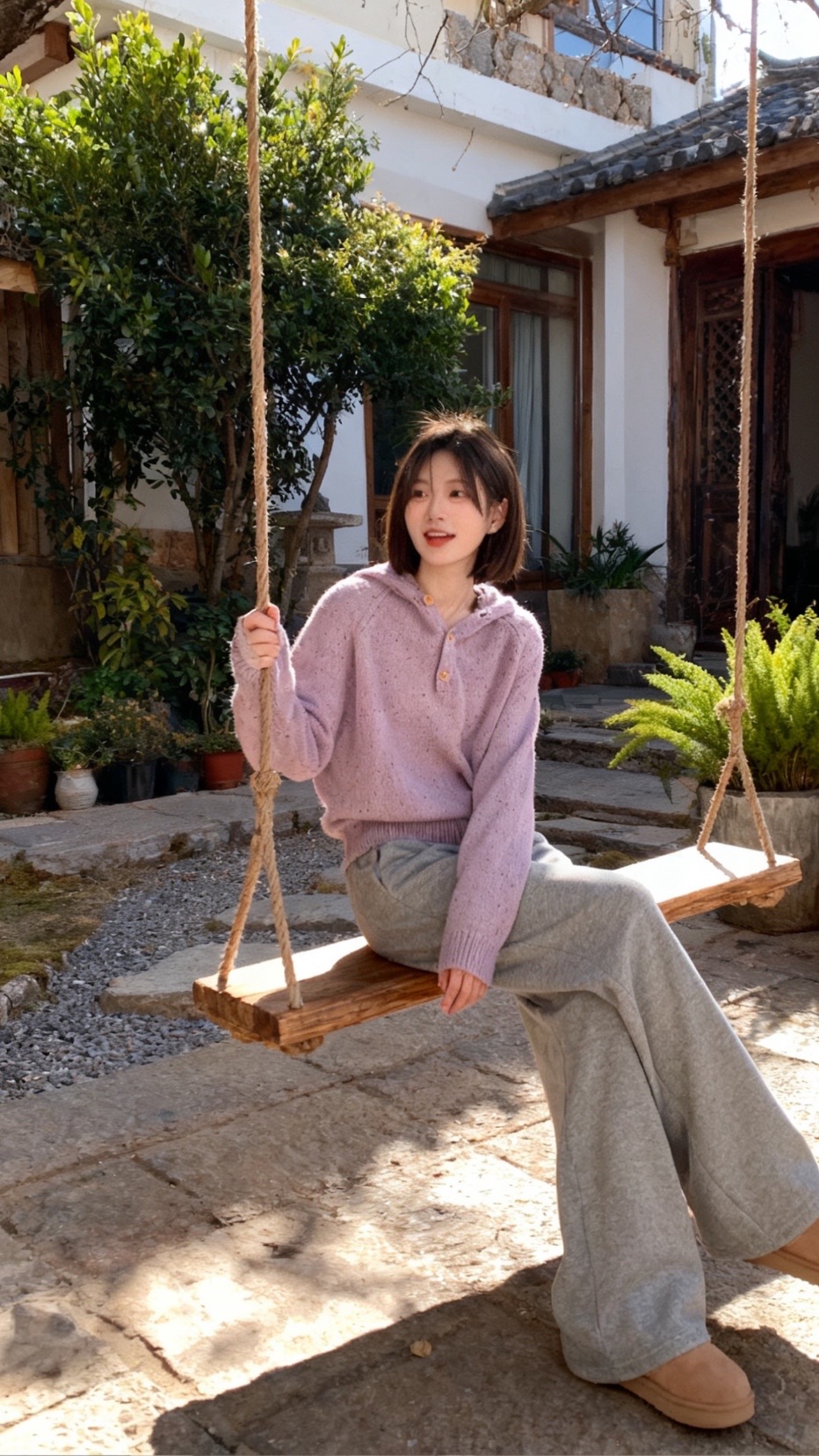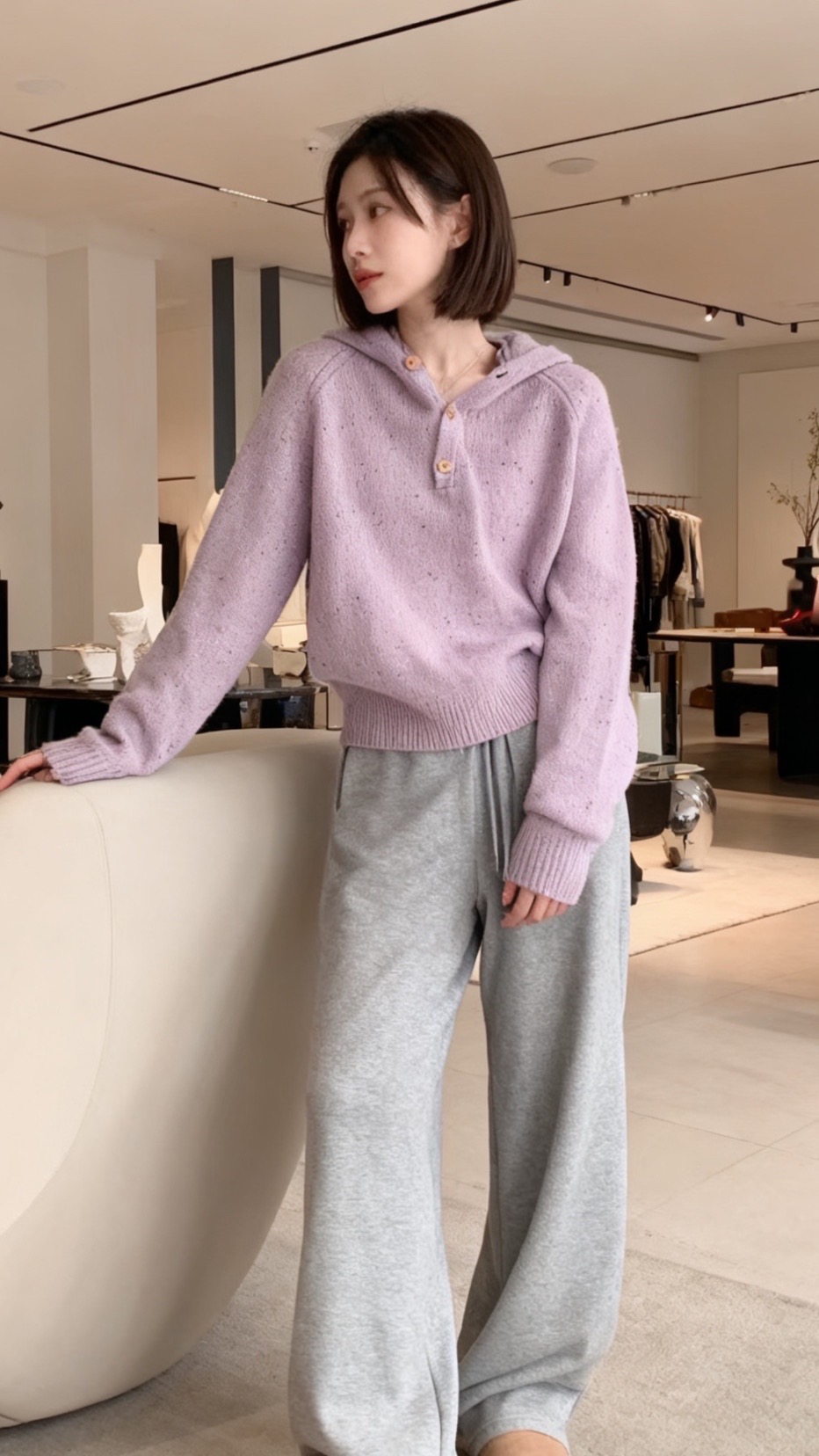 休闲套装 图文伙伴计划 这套真的好韩系啊,上身妥妥的温柔小姐姐。它是一个紫色的连帽毛衣加一条灰色的休闲裤,整体是这种宽松版型,穿起来很舒服,而且这个颜色也太显白了吧,巨量千川 创作灵感上热门 流量扶持