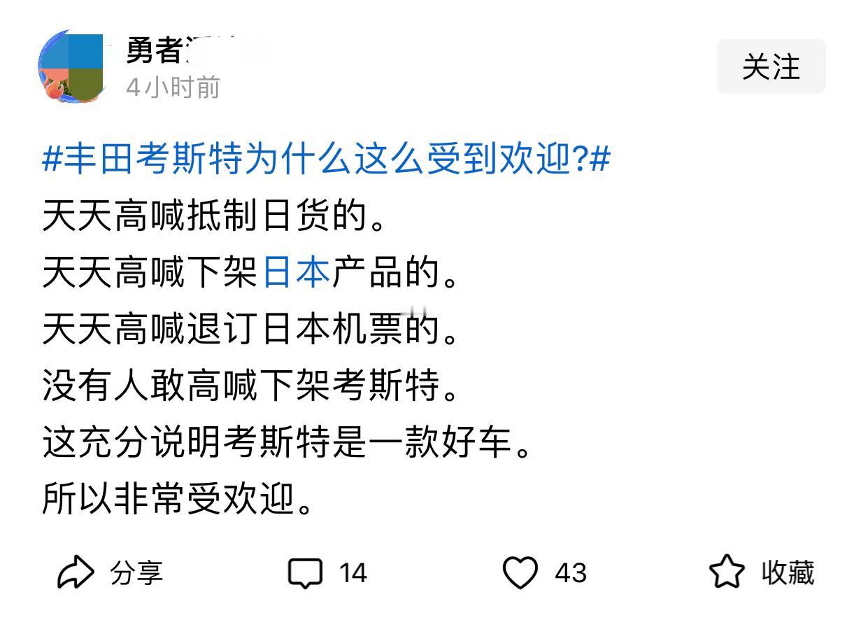 高小姐没咋咋地,恨国党快憋不住了,这位辽宁ip的老铁1天内连发3条消息,1条不满日本电影被禁、1条质疑华为用日本零件、最新的1条还用上了20年前抵制日货的模版,看得出日本被制裁他真的急坏了,这次没人抵制日货也没人要求下架,甚至很多人身边都找不到日货。华为用个日本开关也能被说成没骨气,这不像是在找问题更像是纳投名状。