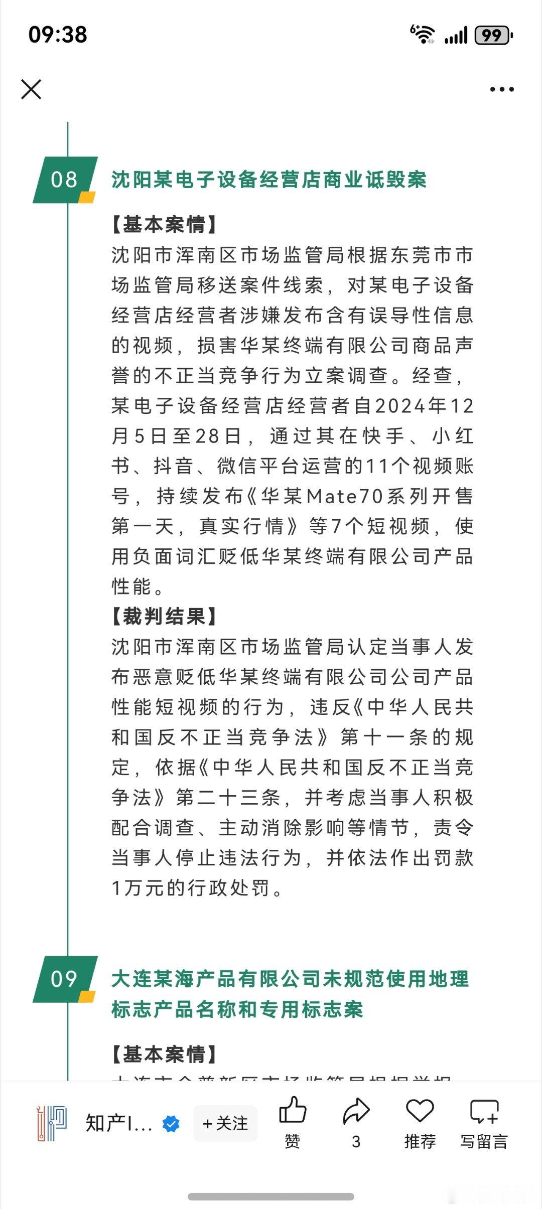 刚看到沈阳市场监督管理局的一个典型案例,对于之前的《华某xx70系列开售第一天,真实行情》《且看且珍惜吧,随时被华某投诉下架》等7条视频,使用暗示性、贬损性内容针对华某终端有限公司产品及商业形象进行不当评价,同时通过煽动负面情绪等方式误导消费者,作出判决。这种故意造谣抹黑的真的应该早给办了!华为近些年遇到这种造谣很多,只能说这次处理大快人心。希望后续的人引以为戒,造谣抹黑迟早会付出代价!