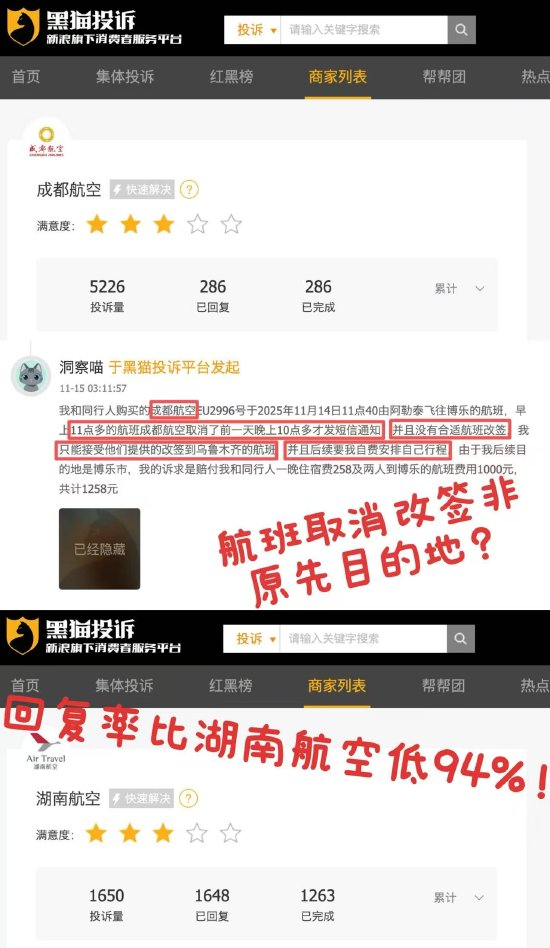 近期,有消费者向黑猫投诉反馈,自己购买成都航空机票后在起飞前一晚10点多才被短信通知航班取消并且没有合适航班改签,只能接受航司提供的改签到非原先目的地的航班,后续产生的任何多余费用都要自行承担,航司不提供任何赔偿。截至目前,成都航空在黑猫投诉平台投诉累计达5226单,回复率仅为5.47%,比湖南航空低94%。
