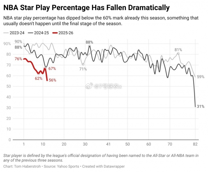 据记者Tom Haberstroh的统计和分析,本赛季至今,球星们的出勤率已经跌穿了60%,最新的数字是56%。这个数字放在以往赛季,通常是在赛季末段才会出现,本赛季开打还没多久,这一现象令人担忧!据统计,NBA球星本赛季的缺席数量已经超过200场,是2023-24赛季同时段的两倍!NBA球员参赛政策中对球星的官方定义是:在过去三个赛季中至少入选过全明星或NBA最佳阵容的球员。本赛季,共有45名球员符合这一标准,这意味着平均每位NBA球星已经缺席了大约五场比赛。另外,即使排除早就确定将长期缺阵的塔图姆、哈利伯顿、利拉德和欧文,明星球员在赛季首月的出场率也仅为75%,远低于两年前的87%。