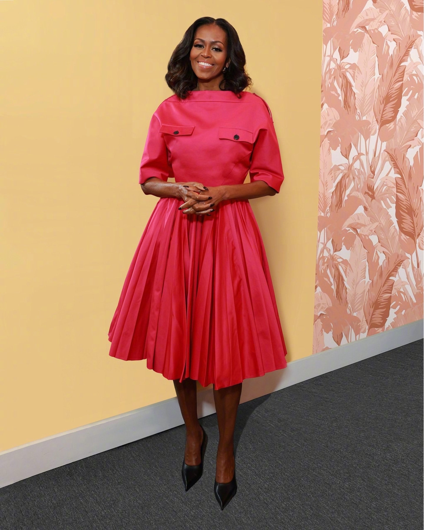 身穿Prada 2026春夏定制裙装在纽约出席活动的米歇尔.奥巴马。瘦身后年轻了很多。图三是2023年。