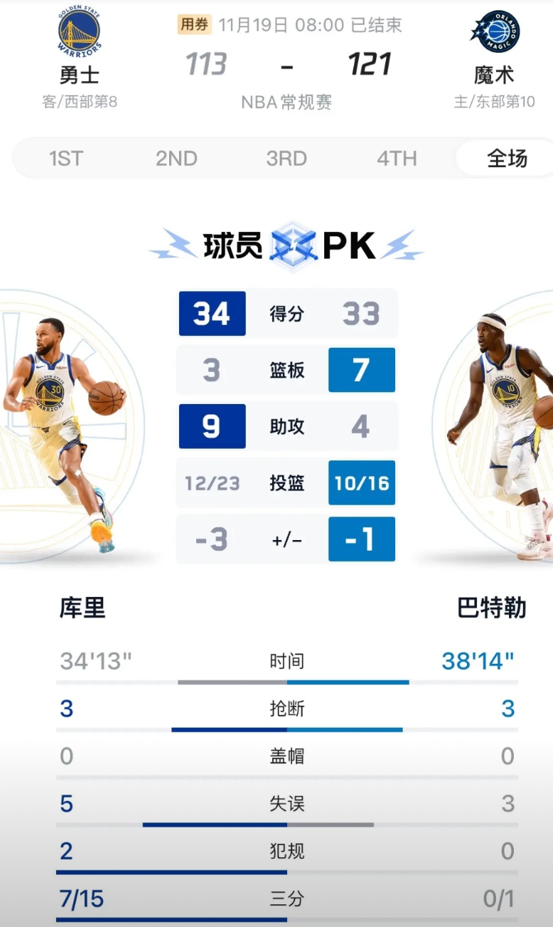 勇士危险了,今天库里和巴特勒都已经发挥到了极致仍然无法阻挡失败,库里15中7的三分,巴特勒15中13的罚球,都把强项发挥到了极致,库里全场34分9助,巴特勒全场33分7板,竟然还是输给了东部第十的魔术,不得不说这赛季的勇士或许无力回天了! 库里虽然9次助攻,但是5次失误,巴特勒末节独揽14分也没办法逆转比赛,因为魔术整体发挥,全队六人上双,几乎所有数据都比勇士更加优秀,年老的勇士越来越暴露出问题了,通过附加赛进入季后赛已经成了勇士比较现实的目标。