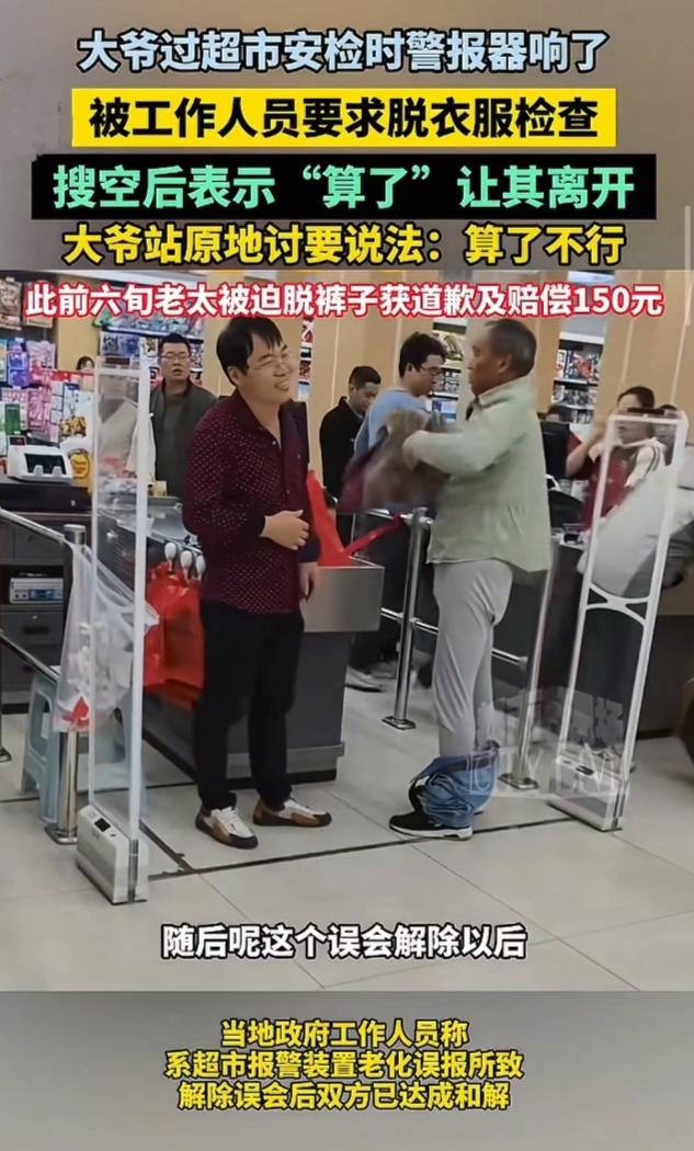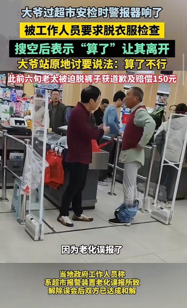 安徽老人当众脱衣自证清白:一句"算了",怎能抵消尊严的重量? 11月9日,安徽巢湖一家超市的安检口,一位老人的举动让无数网友揪心:为了洗清"未付款"的嫌疑,他在众人围观下一件件脱掉衣服,从牛仔裤到保暖裤,从马甲到衬衫,直到身上所剩无几,只为换回一句本该有的信任与尊重。而这一切的起因,不过是安检门的一声误响。 事发当天,老人购物后经过安检时,警报突然响起。工作人员第一反应不是排查设备,而是直接质疑老人"拿了没付钱的东西"。面对否认,工作人员的不信任写在脸上,默许了老人以脱衣的方式自证——或许在他们看来,这只是简单的"核实",却忘了眼前是位看重晚节的长者,忘了超市压根没有搜查他人身体的权利。 第一次脱完牛仔裤,安检门依旧作响;撩起上衣确认无果,机器仍在报警。工作人员两次轻飘飘地说"算了,你走吧",却没有一句道歉,仿佛老人承受的围观与屈辱只是无关紧要的插曲。可对老人而言,这份"算了"比怀疑更伤人:"我在大庭广众下脱衣服,不是为了换一句不了了之!" 愤怒之下,老人继续脱衣,直到仅剩贴身衣物,安检门的警报依然未停。此刻工作人员仍固执认为"你身上肯定有东西",却忘了反思:或许问题根本不在老人身上。事后警方回应揭开真相——大概率是安检机器故障,而衣物金属配件、设备灵敏度异常等都可能引发误报。这场闹剧,终究是机器出错,却让老人买单。 网友的愤怒不无道理:老人的坚持从来不是小题大做。对长辈而言,"清白"二字重过千金,当众脱衣的屈辱,是多少句"算了"都无法抹平的。更关键的是,《消费者权益保护法》早已明确规定,经营者不得搜查消费者的身体及其携带物品,哪怕怀疑盗窃,搜查权也只属于公安机关。重庆曾有类似案例,超市非法搜身老人被判公开道歉并赔偿3000元精神损失,这正是对消费者人格权的有力维护。 超市的安保需求可以理解,但安全绝不能以牺牲他人尊严为代价。当安检门响起,正确的做法是先排查设备故障,再以尊重的方式沟通,若确有嫌疑,可报警处理,而非将怀疑直接转化为对顾客的羞辱。一句真诚的道歉、一次主动的设备检修,远比"算了"更能体现责任与温度。 老人最终在多方协调下与超市和解,但这场事件留下的思考远未结束:我们总说要尊重长辈,可尊重不该只停留在口头;商家追求安全经营,却不能逾越法律与道德的底线。尊严不分年龄,人格权不容侵犯,这从来都不是小题大做。 如果你是这位老人,会选择忍气吞声还是坚持讨说法?超市该如何弥补对老人的伤害?欢迎在评论区留下你的观点。超市安检