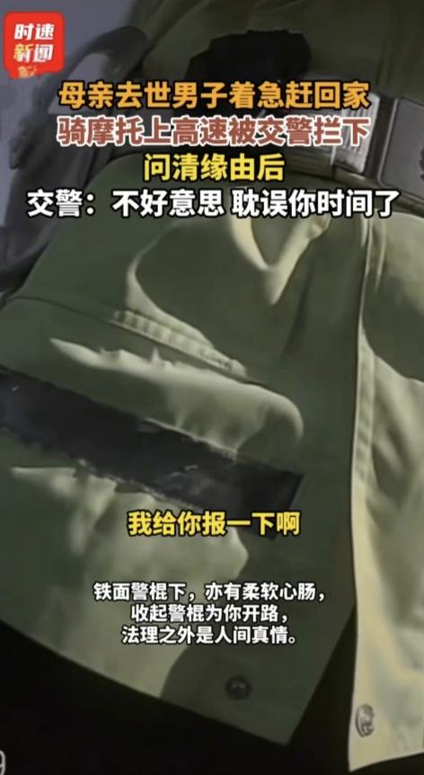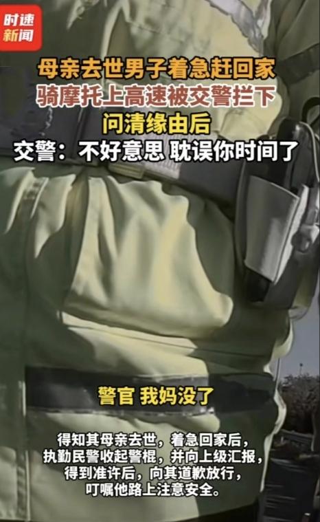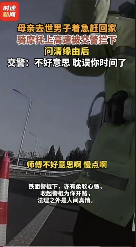 北京街头最暖一幕:“警官,我妈没了”,执法的温度接住了崩溃的他。 11月13日的北京,寒意已浸透街巷,一则短视频却让无数人红了眼眶。一名男子接到母亲离世的噩耗,骑着摩托车疯了似的往通州老家赶,满心只剩“见母亲最后一面”的执念,情急之下误闯了禁止摩托车通行的五环主路,被执勤交警拦下。 “警官,我妈没了……我回家看我妈,不是故意超车,我太着急了。”男子摘下头盔,声音哽咽到破碎,泪水混着寒风淌满脸庞,止不住地颤抖。都说“男儿有泪不轻弹”,可当那个从小护着自己的人突然离去,所有的坚强瞬间崩塌。他的哭声里,藏着“子欲养而亲不待”的悔恨,藏着怕赶不上最后告别的恐慌,更藏着失去人生来处的茫然,让闻者无不揪心。 谁也没想到,接下来的一幕暖透了全网。交警没有刻板执法,而是先稳住男子的情绪,耐心询问路线。得知他要经五环转京津高速返乡后,交警当即表示“我报备一下”,快速沟通协调后便挥手放行,还轻声安慰:“节哀师傅,不好意思耽误你时间了,路上慢点。” 这一幕,完美诠释了“法不容情,但执法者有心”。根据北京交规,摩托车无论京A还是京B牌照,均禁止驶入五环主路,违规本可处以罚款记分,但交警在坚守法律底线的同时,读懂了背后的人间悲喜。就像江西抚州交警送头盔代替罚款、贵州城管帮老人挑货摆摊一样 ,真正的执法从不是“一罚了之”,而是在规则与人性间找到平衡点,让冰冷的法条有了温度。 网友的评论戳中了无数人:“抬棍是流程,收棍是人情”“这声‘不好意思’太戳心,执法者的共情力才是最好的治理”。人到中年,最怕的就是接到老家的紧急电话,那是压垮成年人的最后一根稻草。我们或许都能理解那种慌不择路的心情——哪怕多开一秒,都能离亲人更近一点;哪怕只有万分之一的可能,都想再喊一声“妈”。 这场相遇,没有激烈的争执,没有冰冷的处罚,只有人与人之间最朴素的善意。交警的一句安慰,一次放行,不仅帮男子争取了时间,更在他最崩溃的时刻,递上了一份温暖的支撑。这不是纵容违规,而是执法者的智慧与担当:法律是守护秩序的底线,而人情是照亮人心的光,二者并行,才能让社会既有规矩又有温度。 愿这位男子能赶得上与母亲的最后告别,也愿所有在外打拼的人,都能珍惜与父母相处的时光——别让“忙”成为借口,别等失去才追悔莫及。更要为北京交警点赞,是他们的共情与变通,让我们看到:执法不仅有力度,更有暖到人心底的温度。 你是否也经历过类似的紧急时刻?或是见过这样暖心的执法瞬间?欢迎在评论区分享你的故事,为这份人间善意点赞传递~警官,我妈没了 北京交警执法