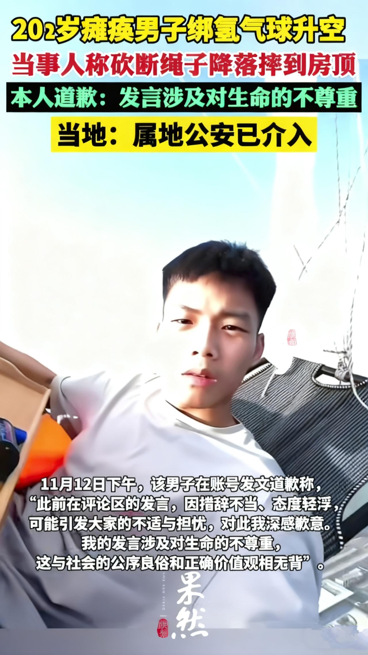 20岁瘫痪小伙绑氢气球"上天":比起博眼球的冒险,我更懂他想活下去的渴望。 “我不知道我还会不会活着回来。” 11月11日,广东惠州一则视频在网络疯传:20岁小伙坐在绑满氢气球的躺椅上缓缓升空,镜头里的他语气平静,却说出了让无数网友揪心的话。没人能想到,这个敢拿生命赌一把的年轻人,背后藏着一段满是伤痛的过往。 去年8月,一场突如其来的车祸彻底改变了他的人生。双腿瘫痪、终身与轮椅为伴,几十万的治疗费掏空了家底,肇事司机全责却让官司陷入僵局。“20岁没钱没车没房,家庭受到重创,我不想做穷小子,我想出人头地”,他在社交平台写下的文字,字字都是对命运的不甘。 或许是走投无路的挣扎,或许是想靠极端方式博取关注,他选择了最危险的“捷径”。在10月18日,他绑氢气球将自己升入百米高空,落时剪断绳子摔落,——没有专业设备,没有安全保障,甚至没买降落伞,全靠“砍断几个气球绳子”控制降落。最终他摔在居民房顶上,颈椎骨裂,昏迷后被送医,住院三天就匆匆出院,“头还有点疼,东西全飞走了,手机也不见了”。 这样拿生命开玩笑的行为,自然引发了全网热议。有人指责他漠视生命、危害公共安全,毕竟氢气球易燃易爆,私自升放不仅违反《升放气球管理办法》,还可能干扰空域秩序,给他人带来未知风险 。律师明确表示,其行为已涉嫌以危险方法危害公共安全罪,若造成严重后果可能面临刑事处罚。也有网友心疼不已:“20岁本该风华正茂,他是被逼到绝境才想出来的笨办法吧”。 11月12日下午,小伙的账号清空了所有视频,随后他发布道歉声明,承认自己“措辞不当、态度轻浮,涉及对生命的不尊重”,承诺今后会以积极正面的态度参与网络交流。惠州市相关部门表示,属地公安已介入调查,残联也在核实他的具体情况,而茂名警方(知情人士透露其家住茂名)则称案件进展不便透露。 看着这场闹剧落幕,我们真的能简单用“博流量”“没脑子”来定义这个年轻人吗?其实在他极端行为的背后,是无数普通人面对困境的无助缩影。20岁的年纪,刚要展开人生画卷就被无情撕碎,治疗费、官司、未来的迷茫,像三座大山压得他喘不过气。网络时代,“出圈”似乎成了最快的翻盘机会,于是他孤注一掷,用最危险的方式发出求救信号。 但我们必须清醒:流量从来不是救赎的良药,漠视规则的冒险只会让自己陷入更深的困境。氢气球能载着他升空,却带不来真正的希望;博来的关注度若没有底线支撑,终究会变成反噬的力量。就像那些为了流量恶意制造对立、散布谣言的网红,最终都逃不过账号被封、法律追责的结局 。 值得欣慰的是,相关部门已经介入调查,或许这会是他人生的转折点。我们期待看到的,不是一个靠极端行为走红的网红,而是一个能得到合理帮扶、重拾生活信心的年轻人。社会的温暖从不是靠博眼球换来的,对于困境中的人来说,政策的扶持、法律的公正、他人的善意,才是真正能托举生命的“安全绳”。 20岁的他,有错吗?当然有,他不该拿自己和他人的安全当赌注。但他的挣扎,是否也该让我们反思:当一个年轻人被逼到绝境时,是否有更多温和的出口让他求助? 最后想问大家:如果你是他,面对倾家荡产、双腿瘫痪的困境,会选择怎样的出路?你觉得对于这样的年轻人,该严惩还是该帮扶?欢迎在评论区留下你的观点。用氢气球绑折叠椅的方式把自己送上了百米高空。