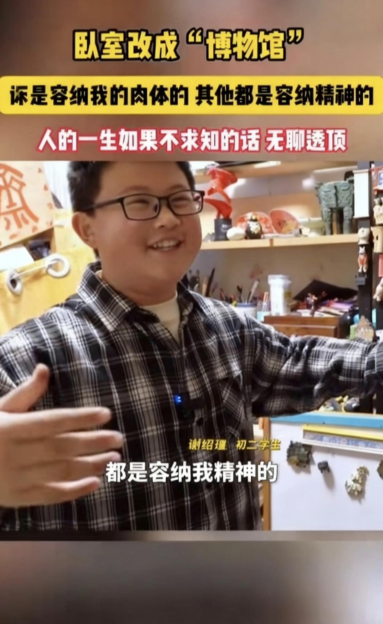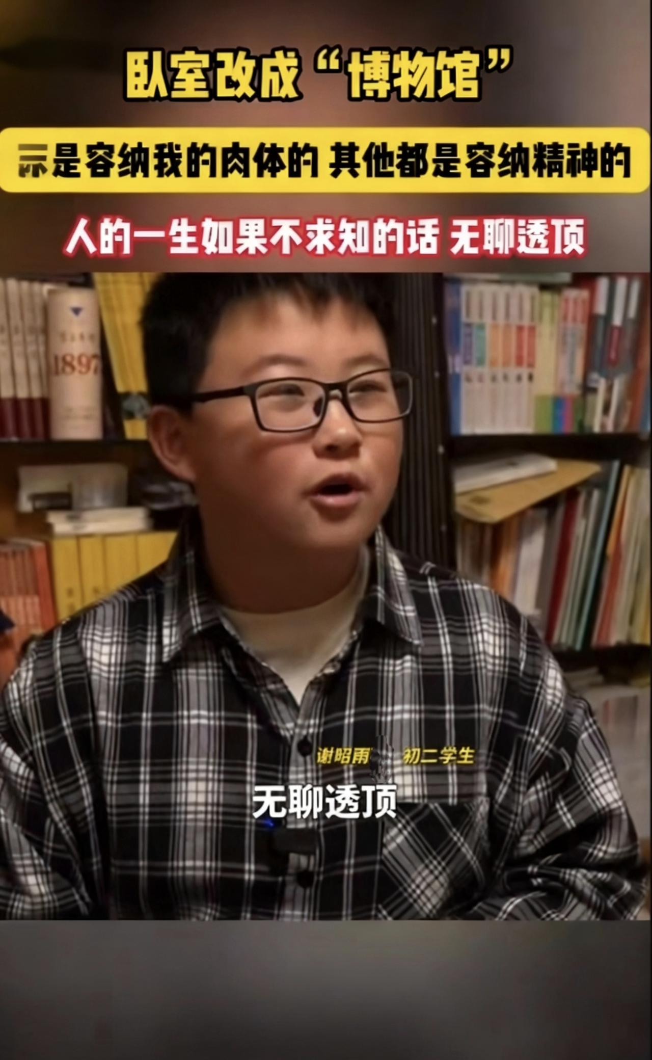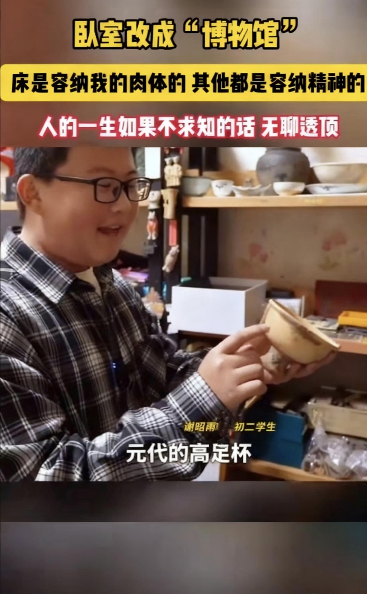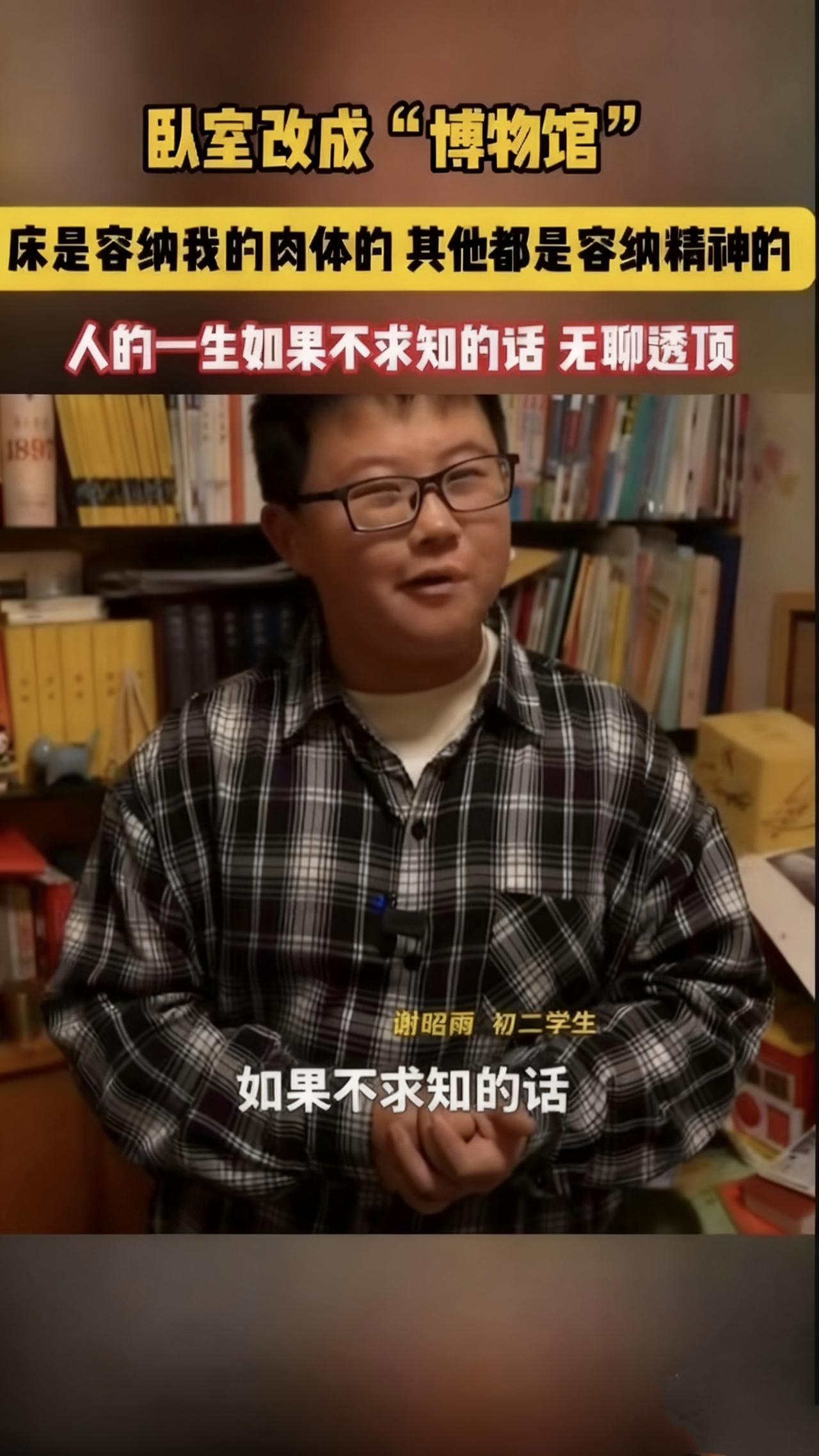 "人的一生如果不求知的话,无聊透顶!"思想成熟、谈吐不凡的河南郑州14岁小孩哥。 当同龄孩子还在为游戏皮肤氪金、刷短视频消磨时光时,河南郑州14岁初中生谢昭雨的卧室,早已变成了一座让人惊叹的“雨堂博物馆”。10平米的小空间里,元代高足杯静静伫立,洛阳汉砖印着千年纹路,满架古籍从地板堆到天花板,唯一空置的地方,只有那张仅够安身的单人床。 “这张床是容纳肉体的,剩下的东西,都在容纳我的精神。”面对镜头,少年谈吐间满是超越年龄的通透。为了填满这个“精神王国”,他把多年攒下的零花钱、压岁钱全砸进了书籍和文物里,宁愿袜子穿到破洞也不轻易更换,却在遇到心仪的古籍时眼都不眨。“人的一生如果不求知的话,无聊透顶!”这句直白的话,戳中了无数在浮躁中迷失的成年人。 走进他的“博物馆”,处处是用心:墙上可能挂着亲手拓印的甲骨文,展柜里藏着用黏土自制的青铜器模型,连床头灯都被改装成太阳神鸟的造型,总成本不足200元,却装满了对历史的热爱。为了搞懂一块汉砖的纹路,他翻遍相关典籍;为了给邮票分类,对着目录查了整整三天;甚至把妈妈用来种石斛的古器物,悄悄纳入收藏清单,字里行间都是少年独有的执着与可爱。 网友们炸开了锅:“别人家孩子拆家,他直接造博物馆!”“这谈吐哪里是初中生,分明是行走的‘老教授’”。更有人感慨,在这个知识碎片化的时代,太多人忙着追逐流量与物质,却忘了静下心来求知的快乐。而谢昭雨用行动告诉我们,青春的潮流从不是跟风模仿,而是找到真正热爱的事,并为之全力以赴。 这份热爱的背后,离不开家人的开明。当他提出要把卧室改成博物馆时,父母没有指责“瞎折腾”,而是给予了最大的支持,这份尊重让兴趣得以自由生长,也成为素质教育最生动的范本。如今,谢昭雨已经开始整理3万字的《沉浸式学习指南》,计划和学校合作开设工作坊,想把这份对知识的热爱传递给更多同龄人。 有人说,这个14岁少年的卧室里,藏着中国教育最好的样子。没有功利的目的,没有强制的要求,只有纯粹的好奇与滚烫的求知欲。当越来越多的孩子被问及梦想只说“想当网红”时,谢昭雨用满屋的书籍与文物证明:精神的富足,永远比物质的堆砌更有力量;对世界的好奇,才是青春最珍贵的底色。 其实我们每个人心中,都曾有过这样一片“求知之地”,只是有人慢慢遗失在了成长的路上。你是否也被这个小孩哥打动?你支持孩子把零花钱用在求知上吗?欢迎在评论区分享你的看法!