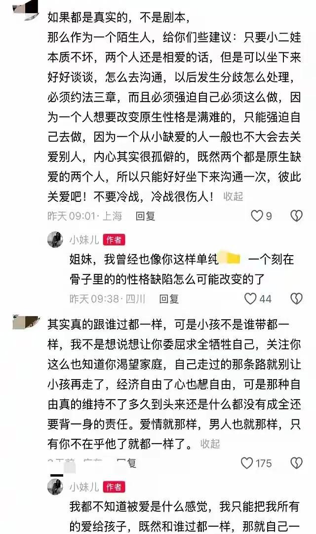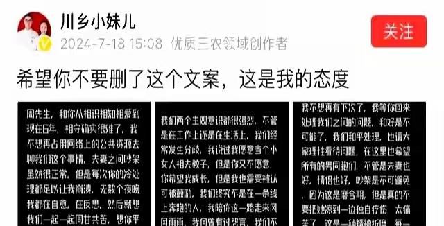 听听,这种不着边际的话! [我想静静][我想静静][我想静静][我想静静][我想静静] 实际上小妹儿没有型男与小妞没有小二娃,她还在理发店洗头,还在传销窝点。小二娃知道小妹儿的底子。还算守口如瓶。直到九月小妹儿还在炒离婚的话题,小妹儿做传销的事情才被小二娃发离婚协议的时候,标题发出来的。 小二娃也是忍不了才公开离婚协议,因为小妹儿说她什么都没有得到,只有两个娃。 小二娃觉得小妹儿撒了太多谎言了。 明明要离的是她,财产她也有份,小孩她有份,但她就是要天天直播卖惨。 把小二娃塑造成了渣男,路男,出轨男,陈世美…… 小二娃的幺爹知道小妹儿的来时路。 粉丝也知道小二娃是怎么让小妹儿追到手的。 小妹儿一婚没让前夫好起来, 小妹儿二婚和小二娃同时好起来。 三月离婚,小妹儿创造了让粉丝觉得小二娃九月才抛妻弃子的错觉。 小二娃冤枉啊! 实际上小妹儿老早就闹离婚了。 小二娃不离还不行,小妹儿隔一阵就要离,隔一阵就直接发文章就在网络上炒离婚的话题。 每一阵子都要劝她不要乱发离婚文案到网络上让人看笑话,小妹儿还是要发,还叫小二娃不要删。 小二娃离了也不行,离了就是冷暴力,陈世美,养鹅,养小三。